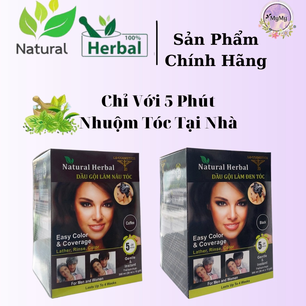 Dầu Gội Nhuộm Tóc - Thuốc Nhuộm Thảo Dược Natural Herbal - Phủ Bạc 100% - Không Rát Da Đầu Màu Nâu & Đen 1 Hộp 10 Gói.