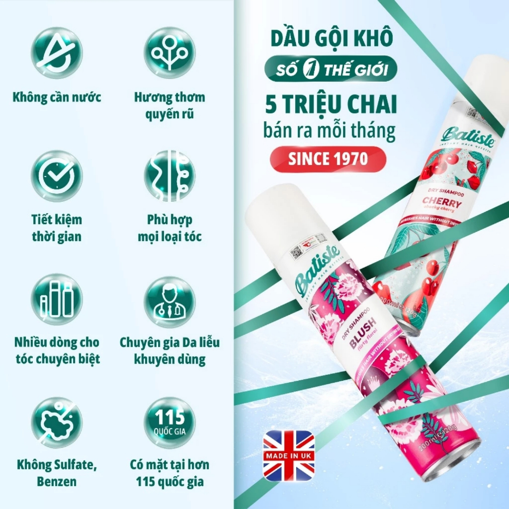 Batiste dầu gội khô 200ml chính hãng có VAT, Dầu gội khô Batiste làm sạch và suôn mượt tóc tức thì