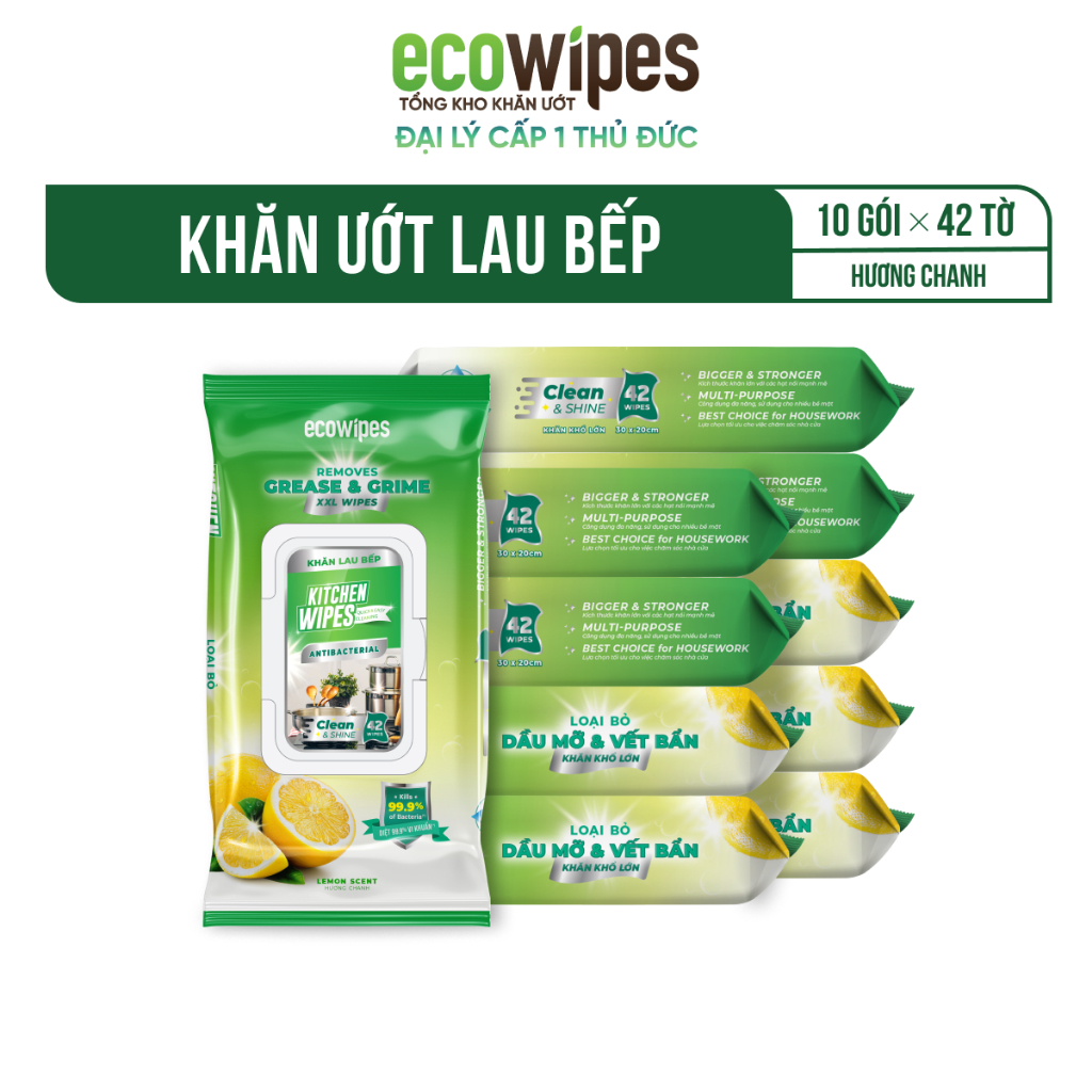 KHO THỦ ĐỨC_Thùng 10 gói khăn lau bếp Kitchen EcoWipes gói 42 tờ hương chanh khử mùi sạch bong