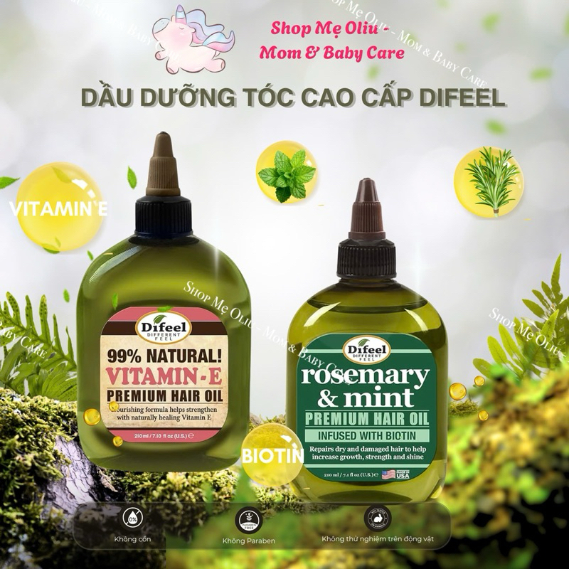 Dầu ủ kích mọc tóc hương thảo, bạc hà Difeel bổ sung Biotin, Dầu dưỡng tóc Rosemary and Mint Premium Hair Oil 210ml