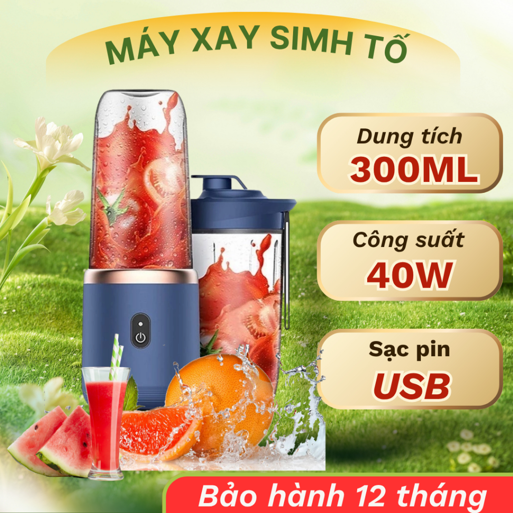 Máy Xay Sinh Tố Cầm Tay Mini Không Dây 40W, Máy Say Sinh Tố Có 6 Lưỡi Dao Không Gỉ Sét Kèm Cáp Sạc USB Tiện Dụng HOMELY