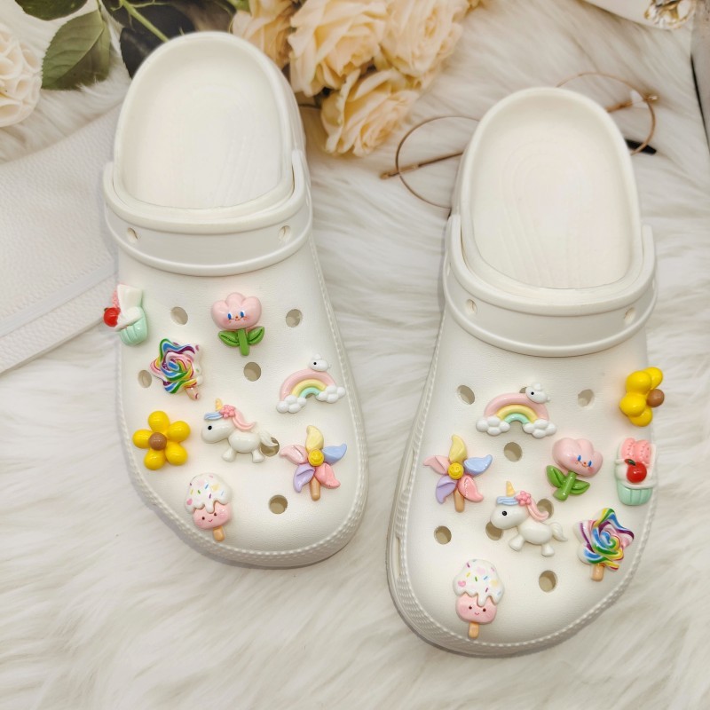 8 Cái / bộ Nút Lên Giày Quyến Rũ Bóng Cầu Vồng Cối Xay Gió Pony Croc Jibz Giày Sân Vườn Pin