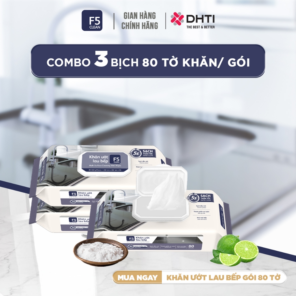 Combo 5 Gói Khăn ướt 80 tờ đa năng lau bếp F5 Clean sạch bóng mọi bề mặt đa năng mềm mại