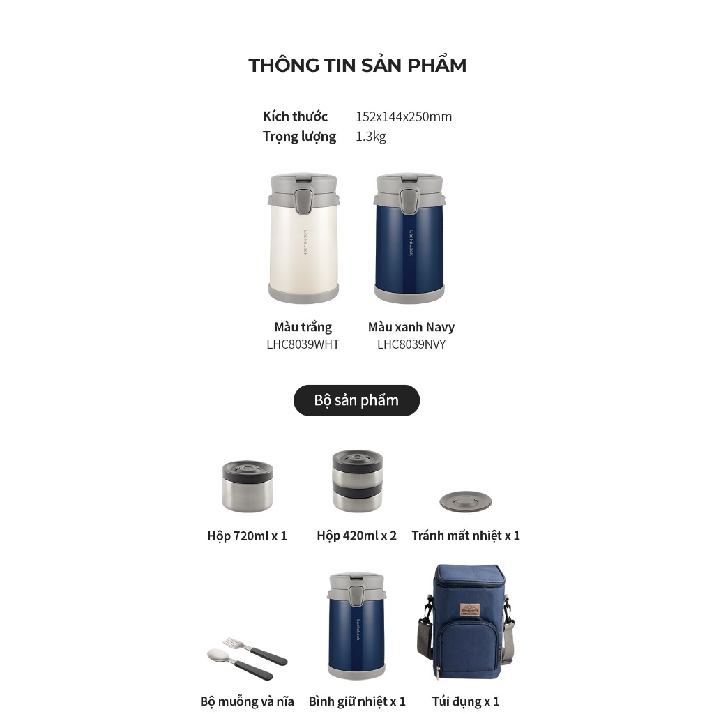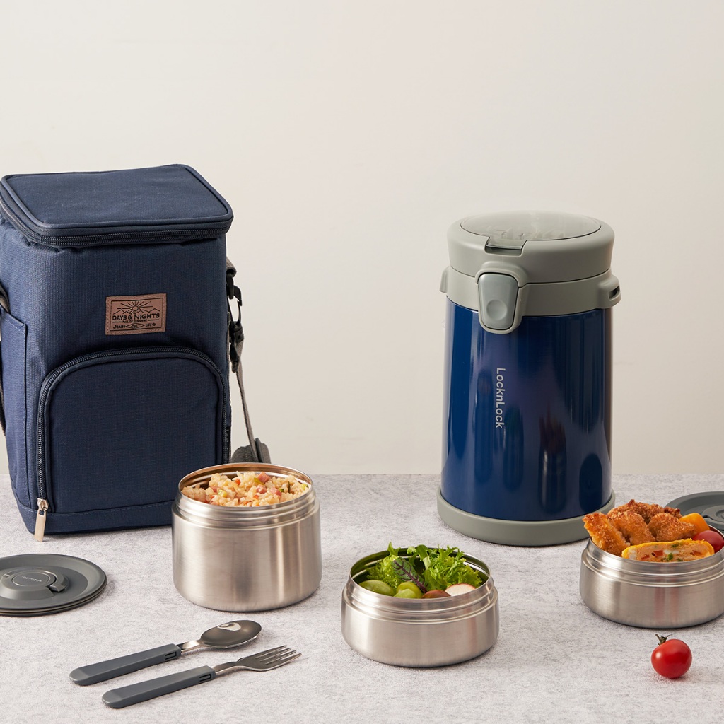 Bộ hộp cơm giữ nhiệt LocknLock LHC8039 2L Màu Xanh, có túi đựng, 3 hộp đựng và bộ muỗng nĩa - K-MALL