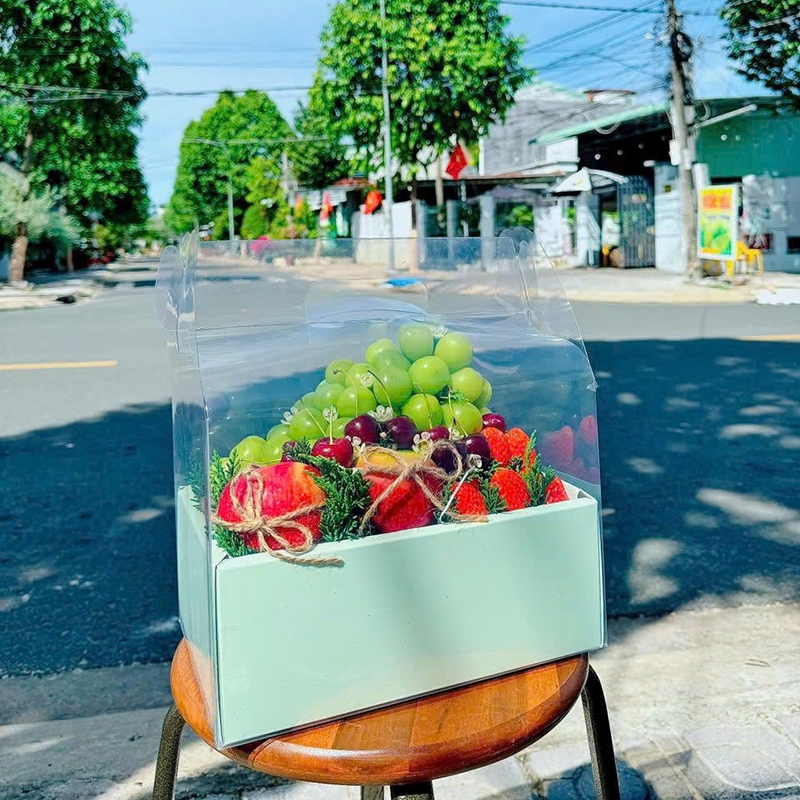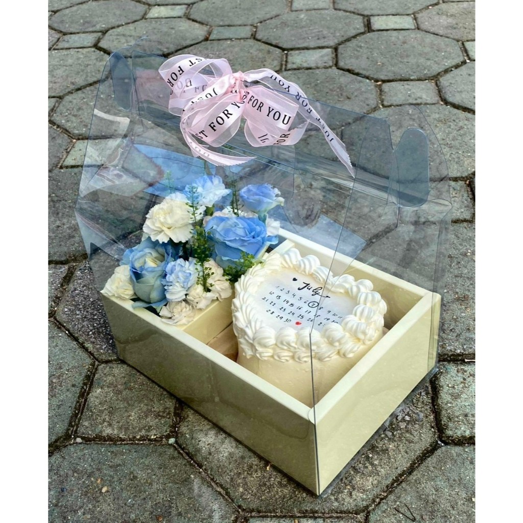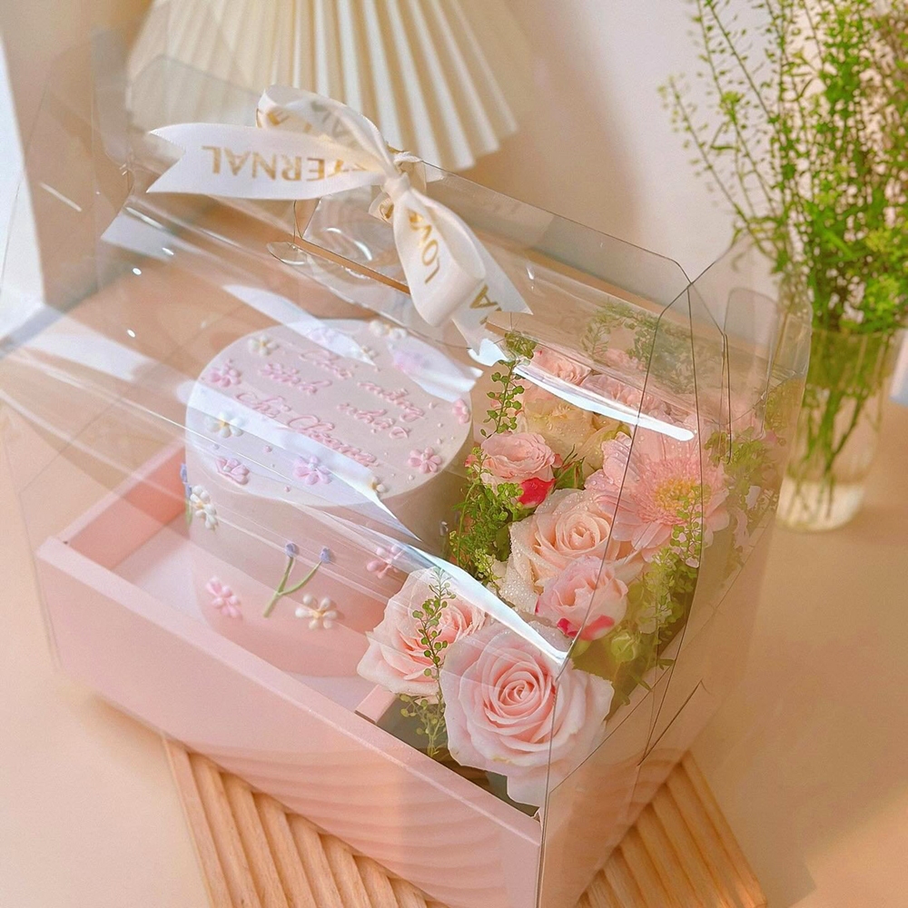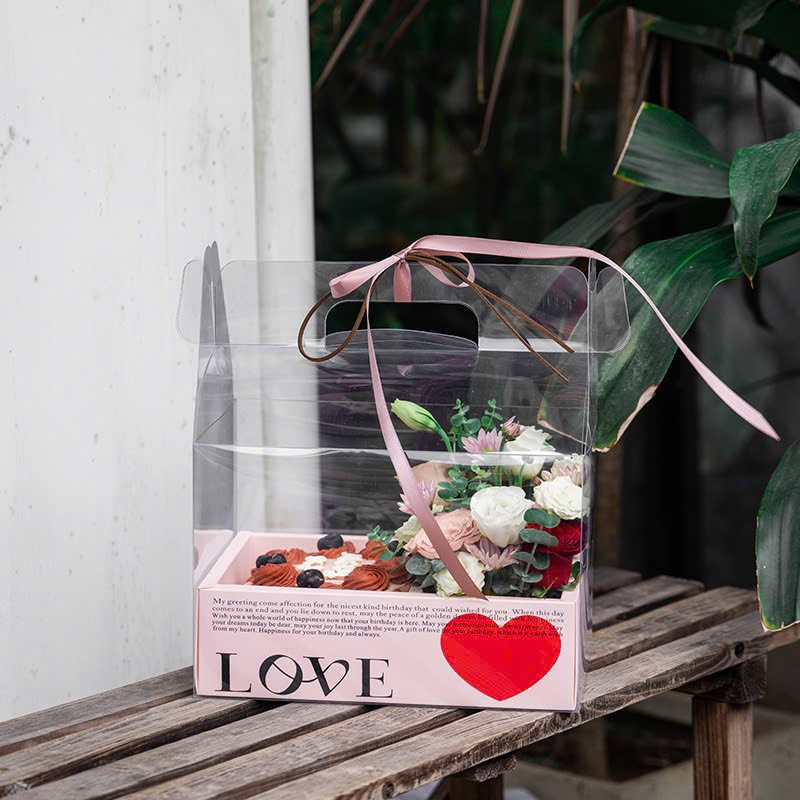 Hộp Mica trong suốt 2 ngăn có quai xách ECOBOX, đựng bánh và hoa, quà tặng handmade, kèm đế đỏ, hồng, trắng chữ love