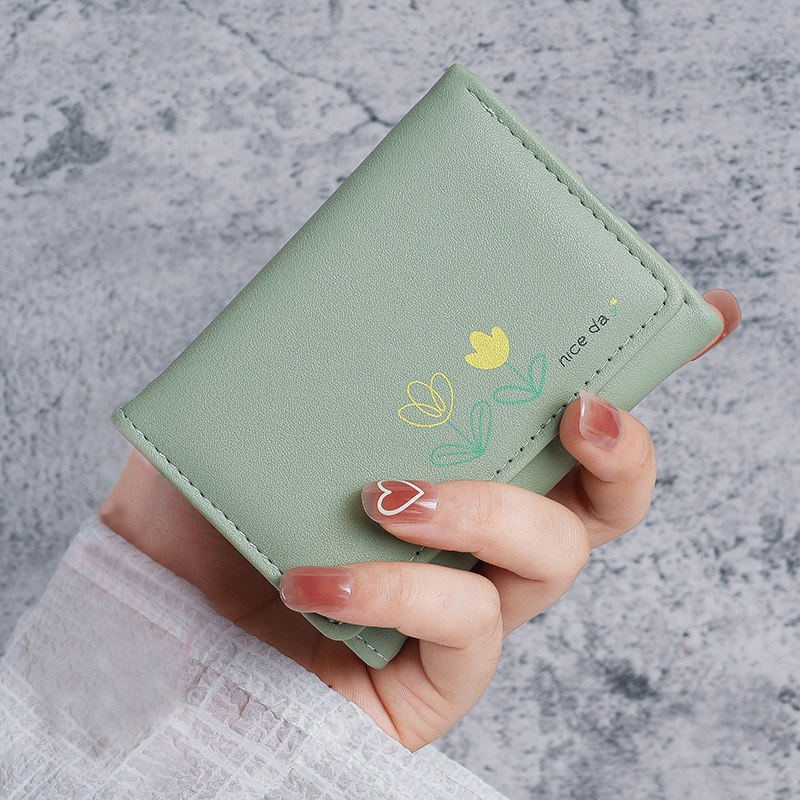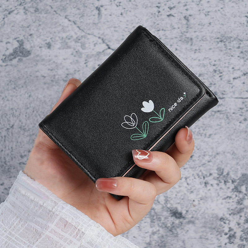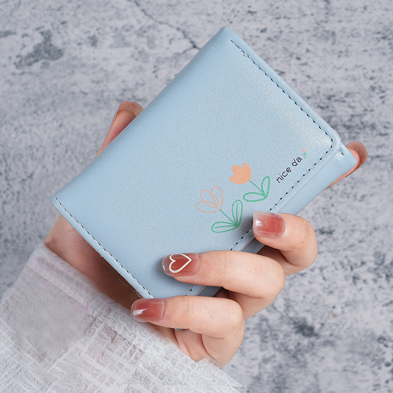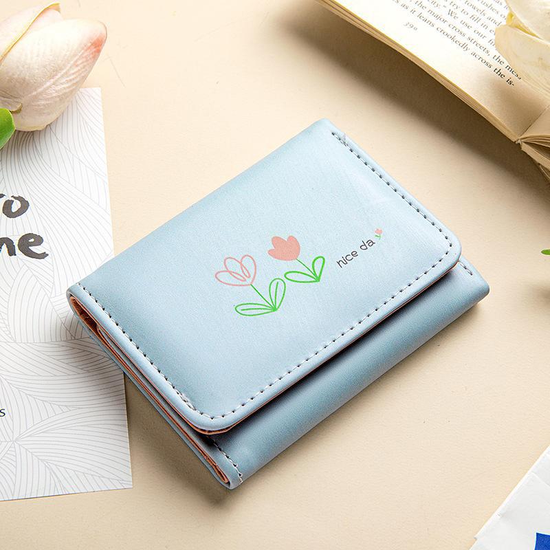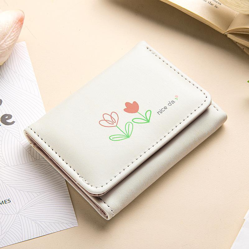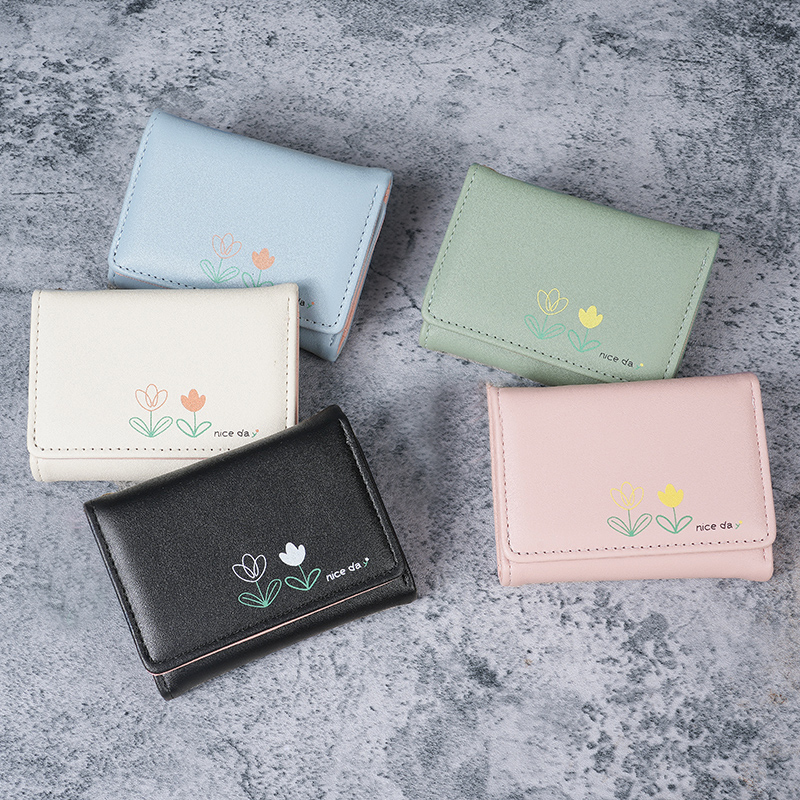 Ví PU Phong Cách Hàn Quốc - Thiết Kế Nhỏ Gọn 3 Tầng - In Bó Hoa Hoạt Hình Dễ Thương - Phụ Kiện Thời Trang Sinh Viên