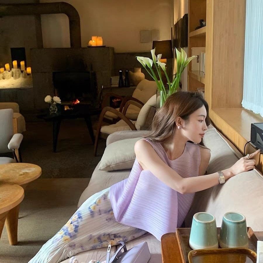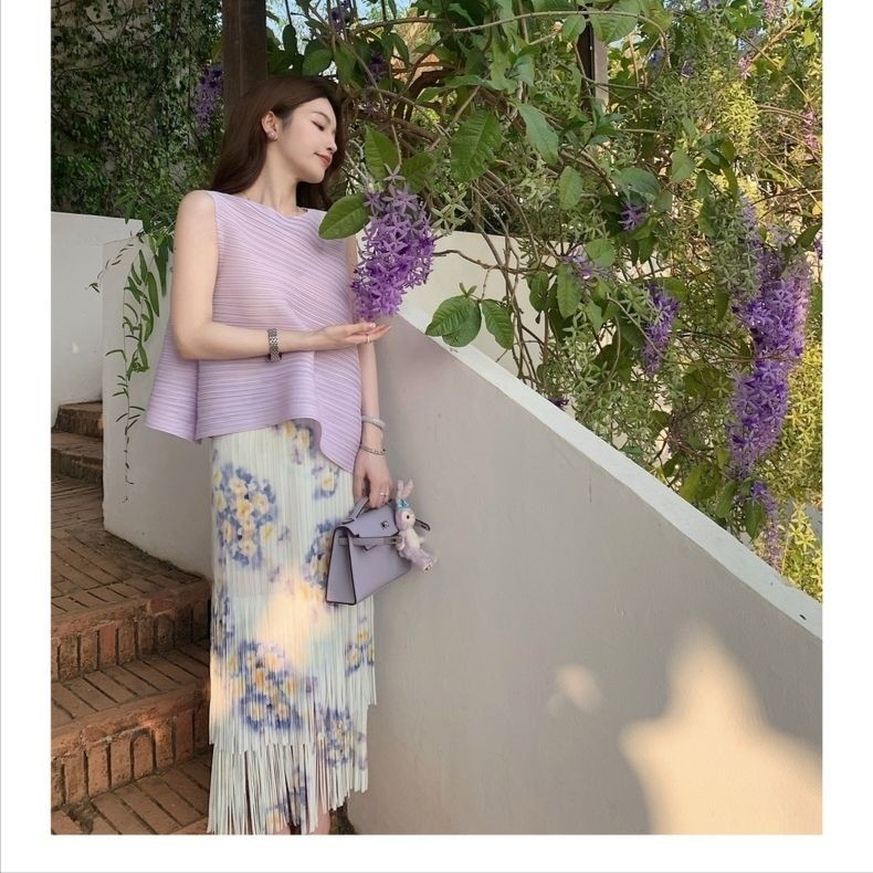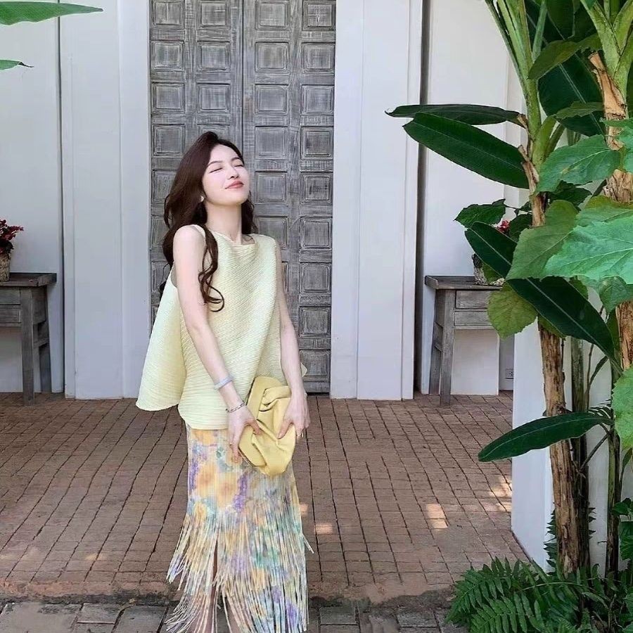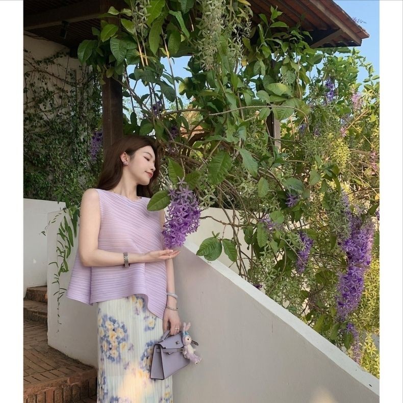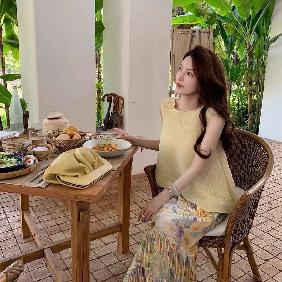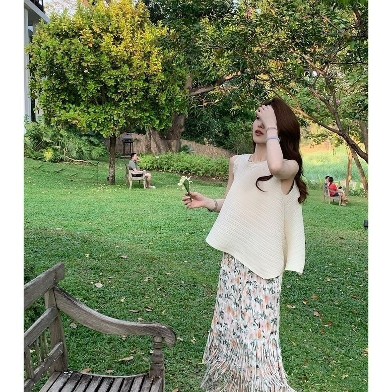Miyake Mười Ngàn Pampers Cảm Giác Cao Cấp Trắng Lười Không Tay Top Màu Xếp Ly Viền Váy Nữ Mùa Hè