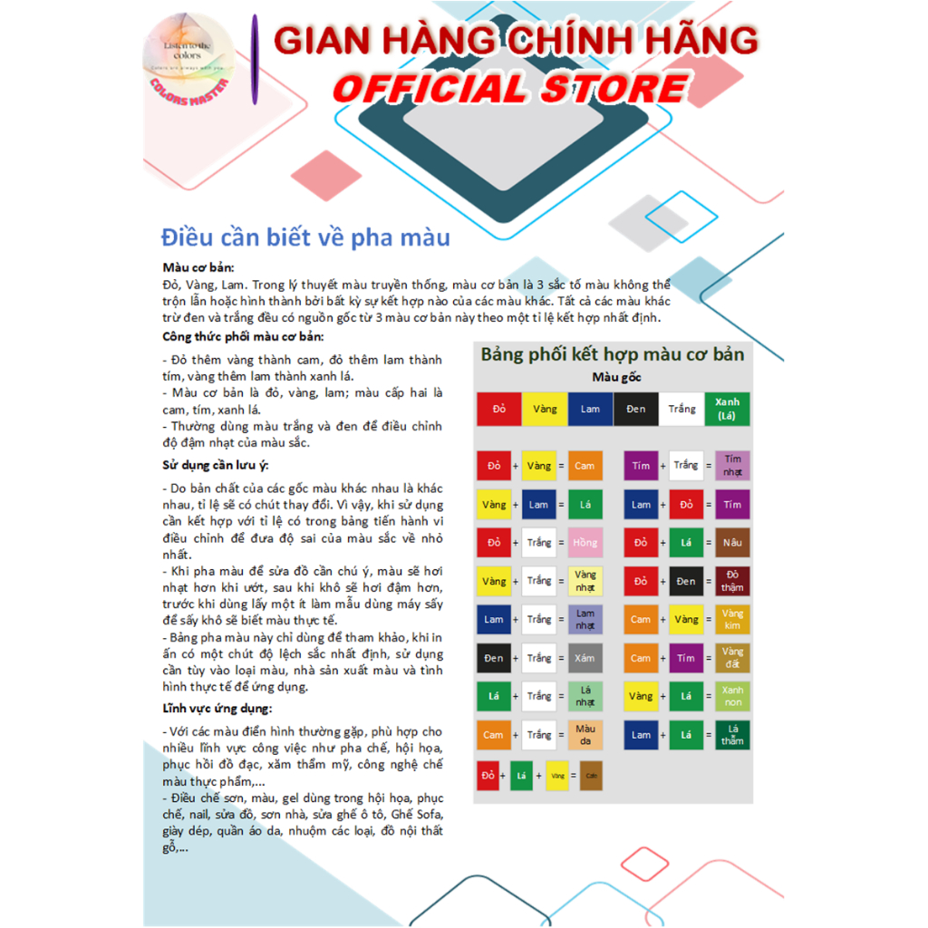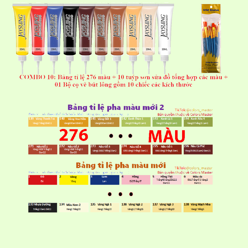 Bảng tỉ lệ pha 276 màu, hướng dẫn công thức pha màu, dùng trong điều chế màu các loại sơn, màu vẽ, phục chế, acrylic