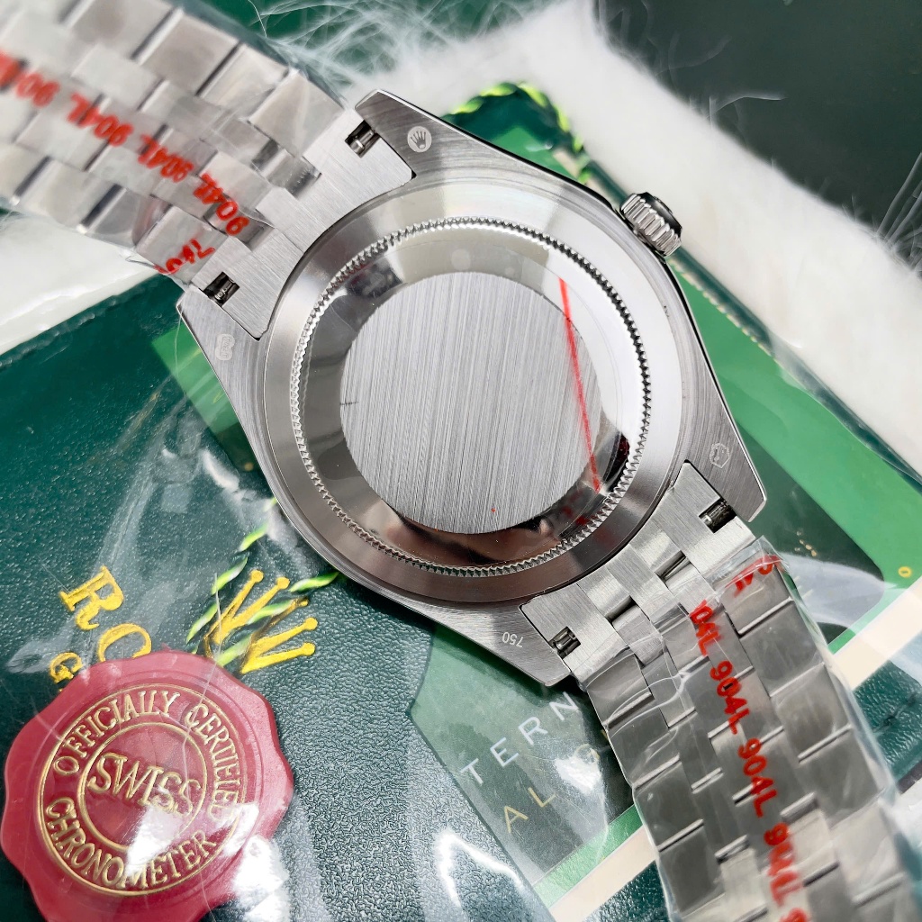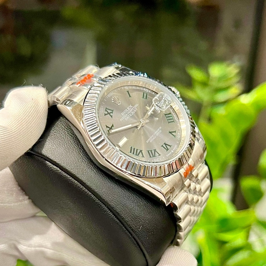Đồng Hồ Nam Rolex Date Just, Máy Cơ Nhật Bản, Mặt Xám Số La Mã, Viền Đá Swarovski Lấp Lánh, Thép 904L, Kính Saphia