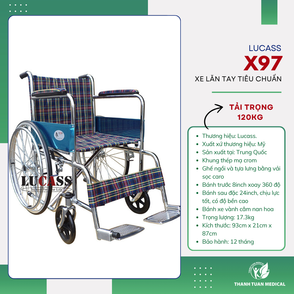 Xe lăn cao cấp Lucass X97 có ghế ngồi, tựa lưng vải sọc caro ngồi lâu không bị nóng lưng - BH 1 năm