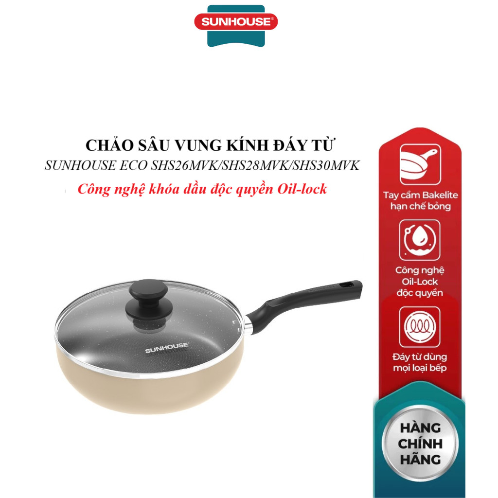CHẢO SÂU ĐÁY TỪ SUNHOUSE ECO SHS26MVK, SHS26MVK,SHS26MVK, Vung kính cường lực viền inox, Công nghệ khóa dầu Oil-lock