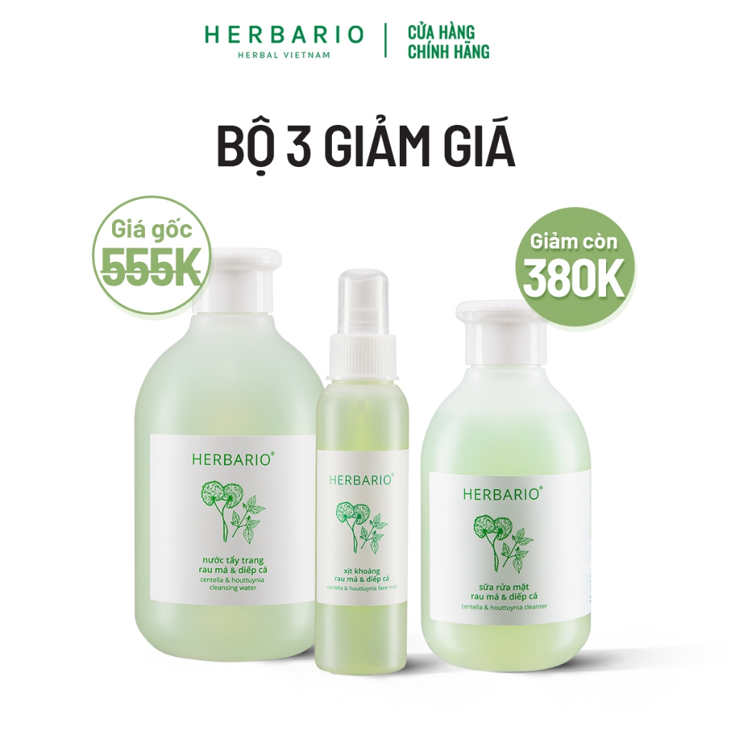 [SET QUÀ THƯƠNG DA DỊU ÊM]Bộ 3 rau má diếp cá Herbario thuần chay:Nước tẩy trang 300ml+Sữa rửa măt 200ml+Xịt khoáng100ml