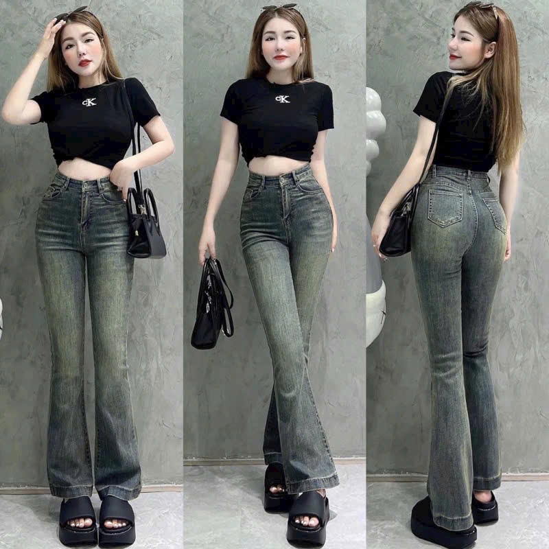 Quần bò jeans nữ ống loe cạp cao co dãn 4 chiều loe xẻ gấu, loe may gấu, loe cắt gấu NC Clothing