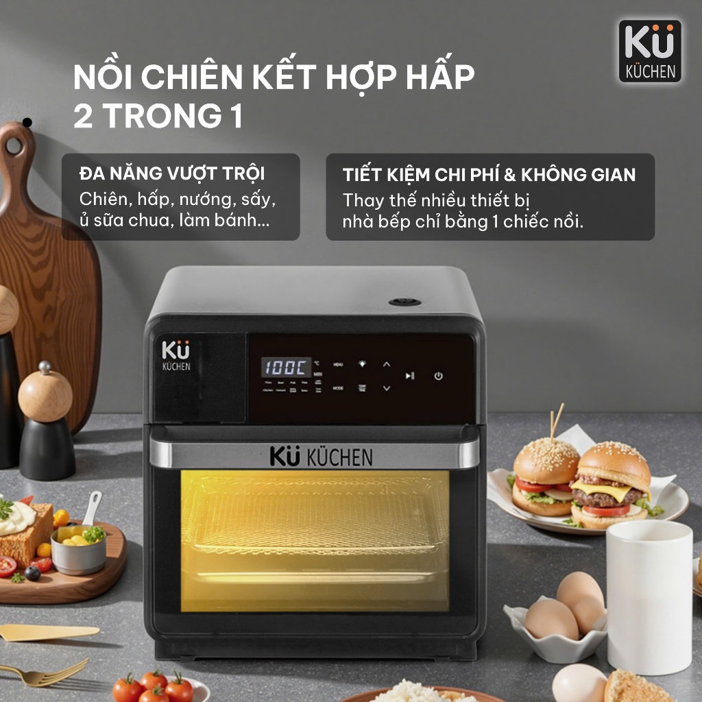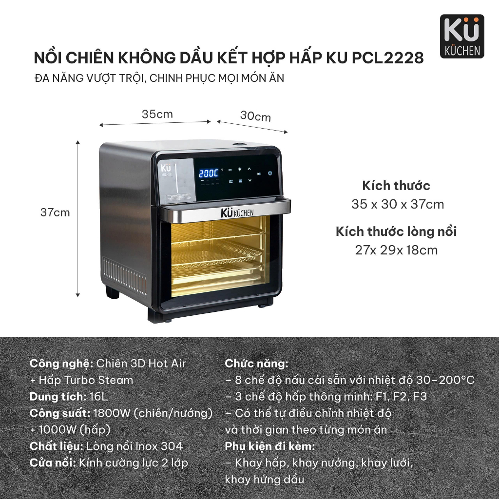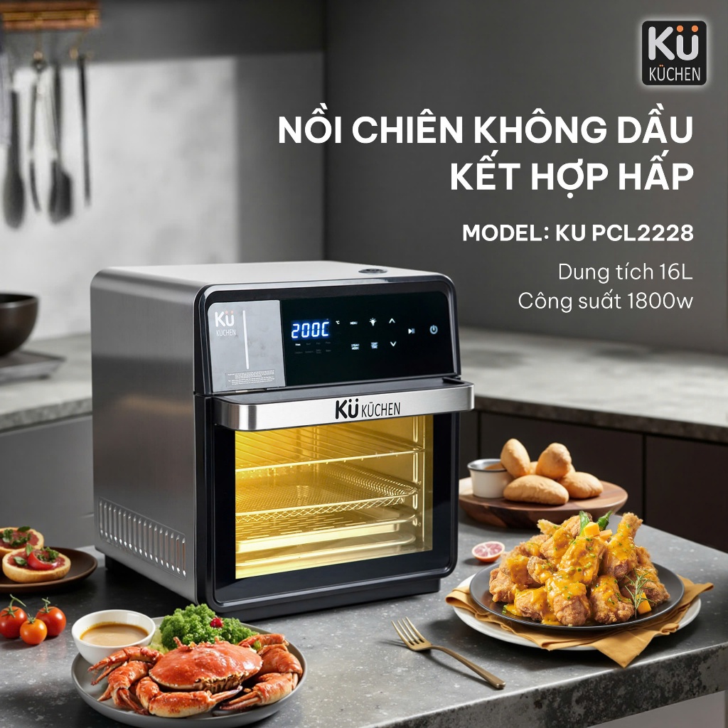 Nồi chiên không dầu kết hợp hấp KUCHEN KU PCL2228 16L bảo hành 24 tháng l Sẵn phụ kiện thay thế