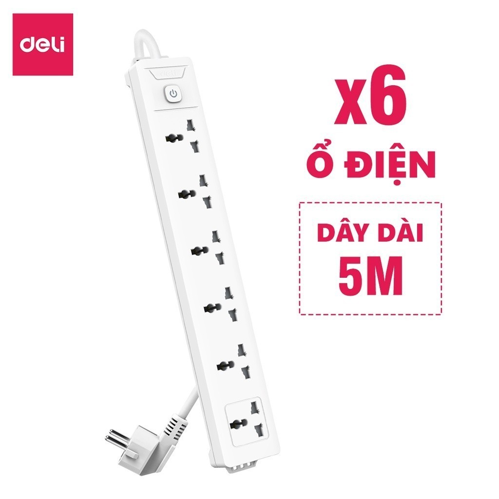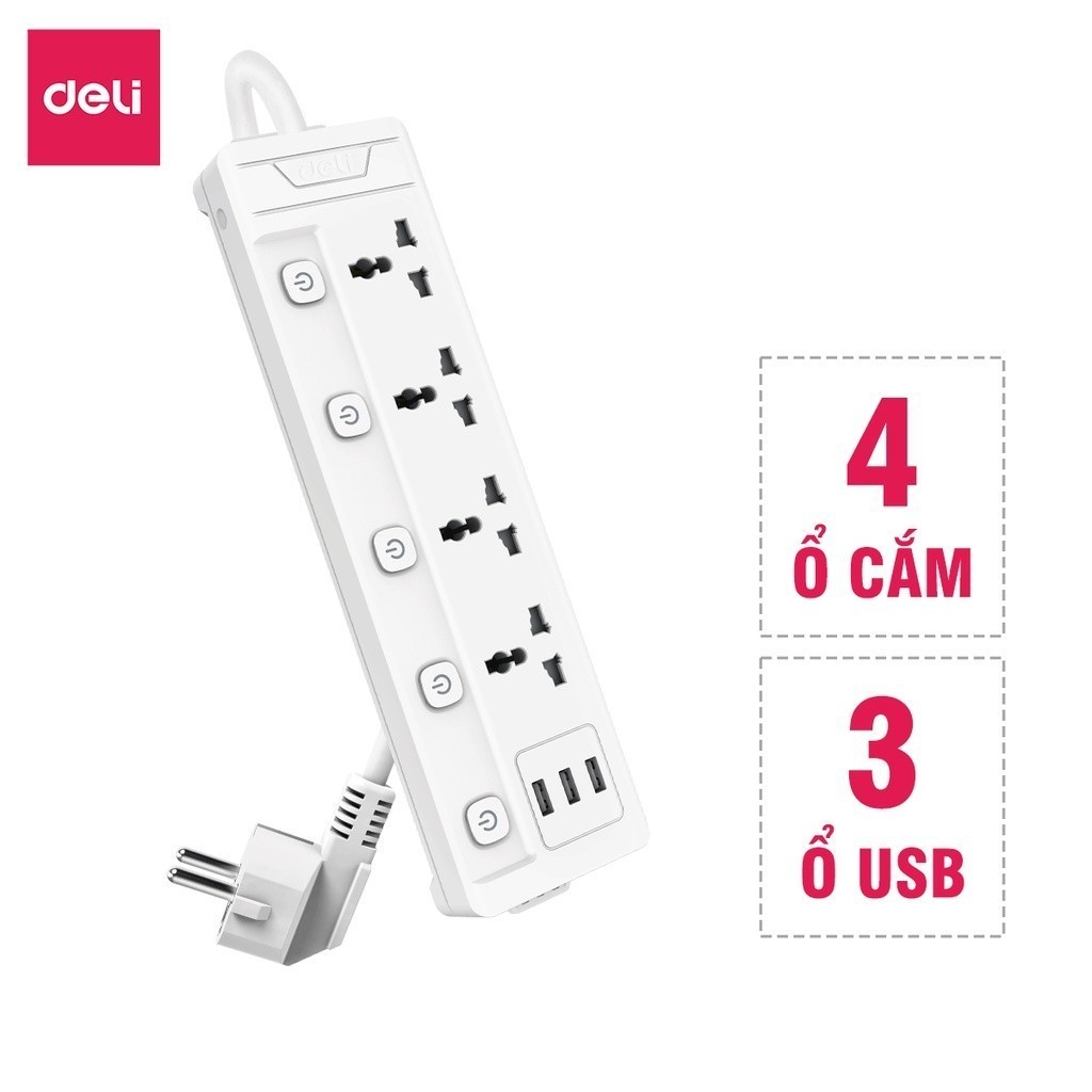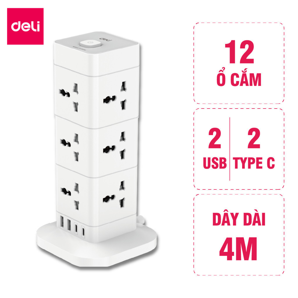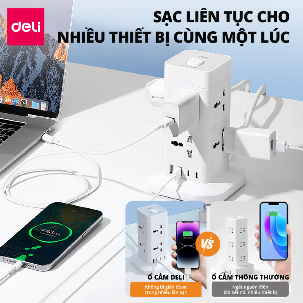 Ổ Cắm Điện Đa Năng DELI Cổng Type C USB Sạc Nhanh PD 20W 2-12 Ổ Vuông Dẹt Chịu Tải 3250W Cầu Chì Tự Ngắt Khi Quá Tải