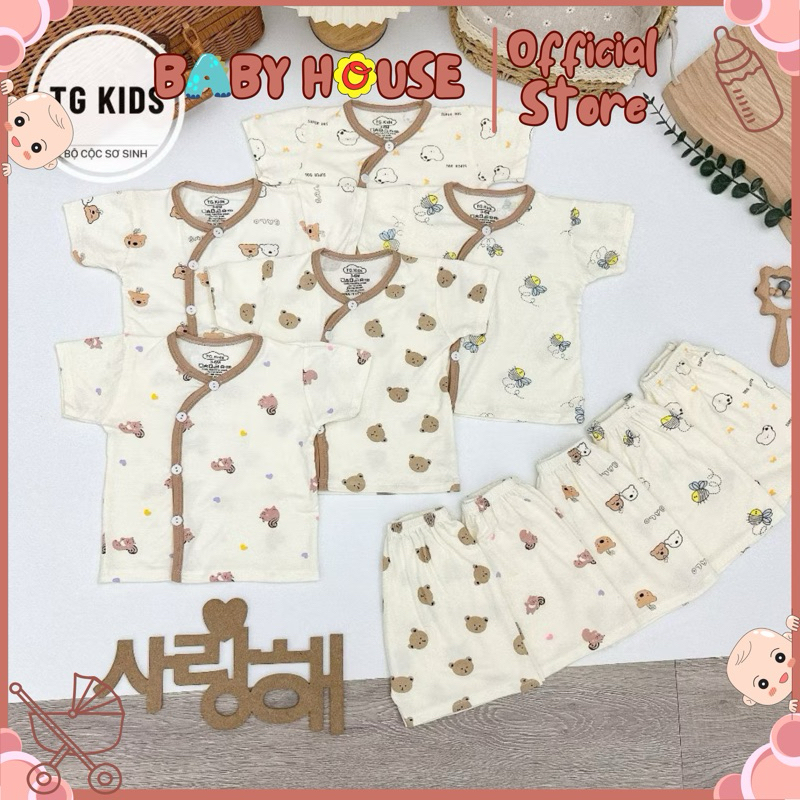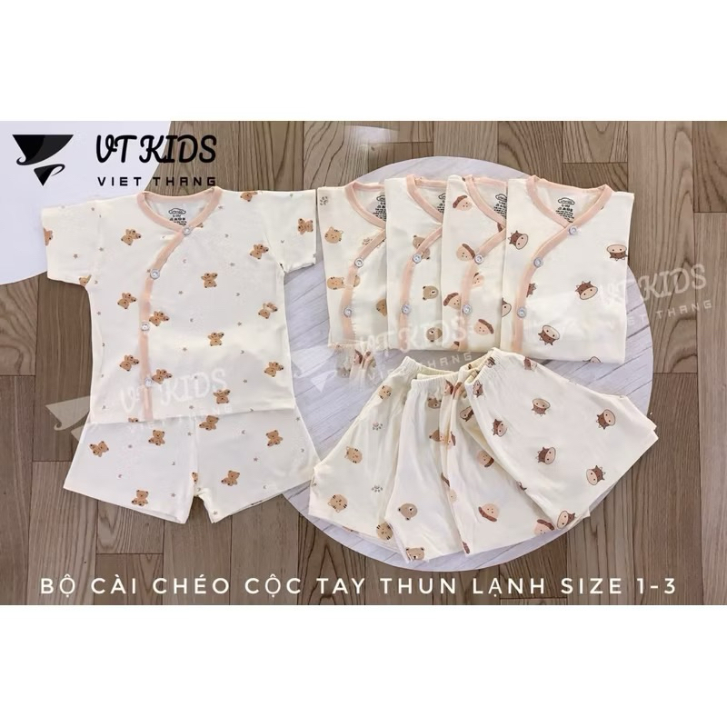 Set 5 Bộ Quần Áo Cộc Tay Thun Lạnh Màu Kem In Họa Tiết Khuy Lệch Cho Bé 0-9 Tháng