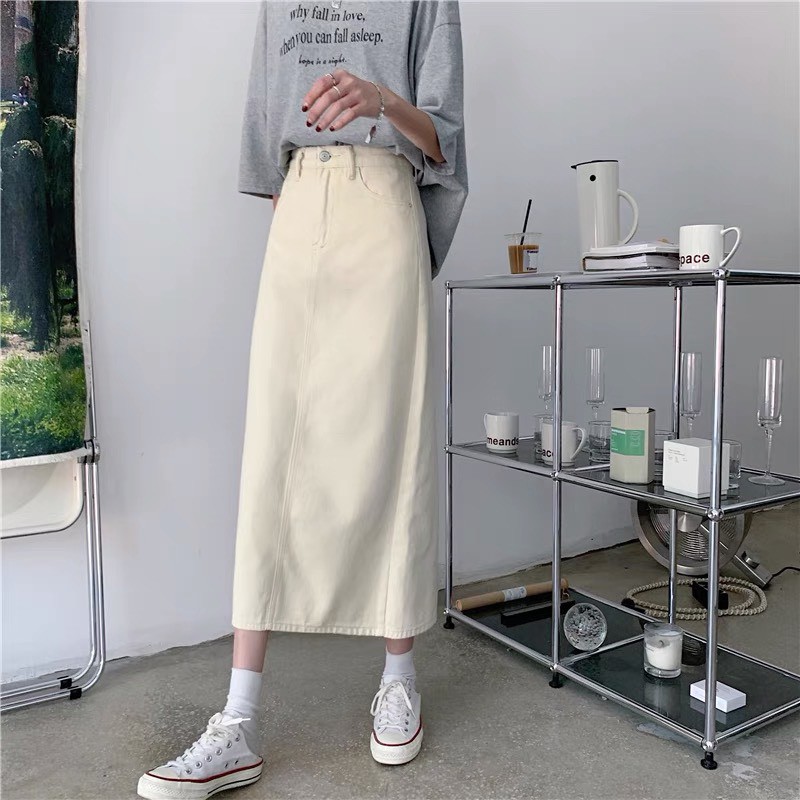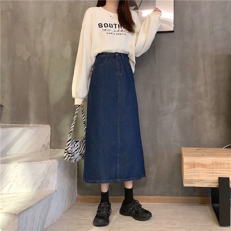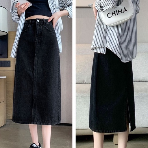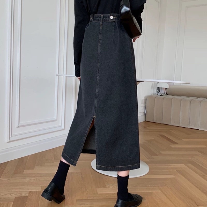 Chân váy jean dài KABICO cạp điều chỉnh độ rộng bụng phong cách, váy jean dáng dài cạp cao thanh lịch A14