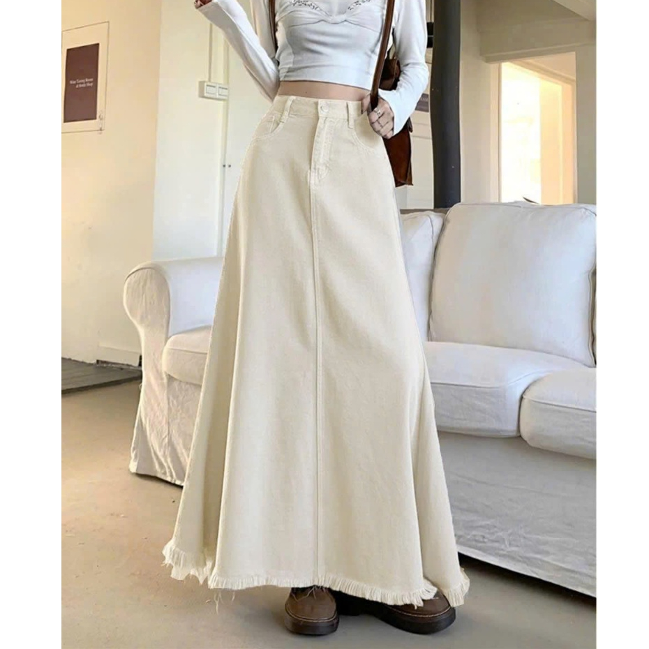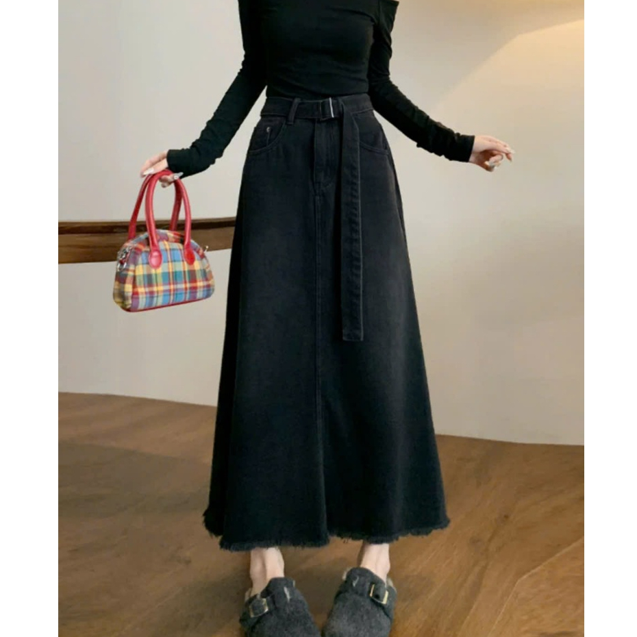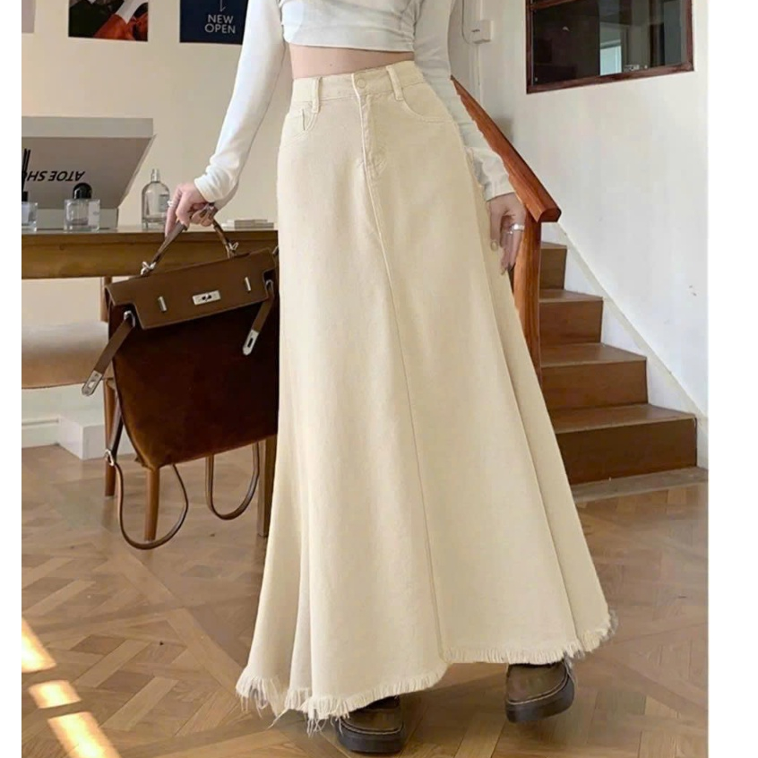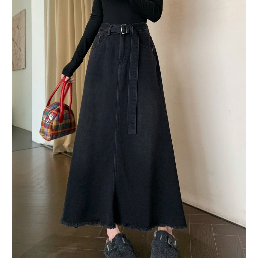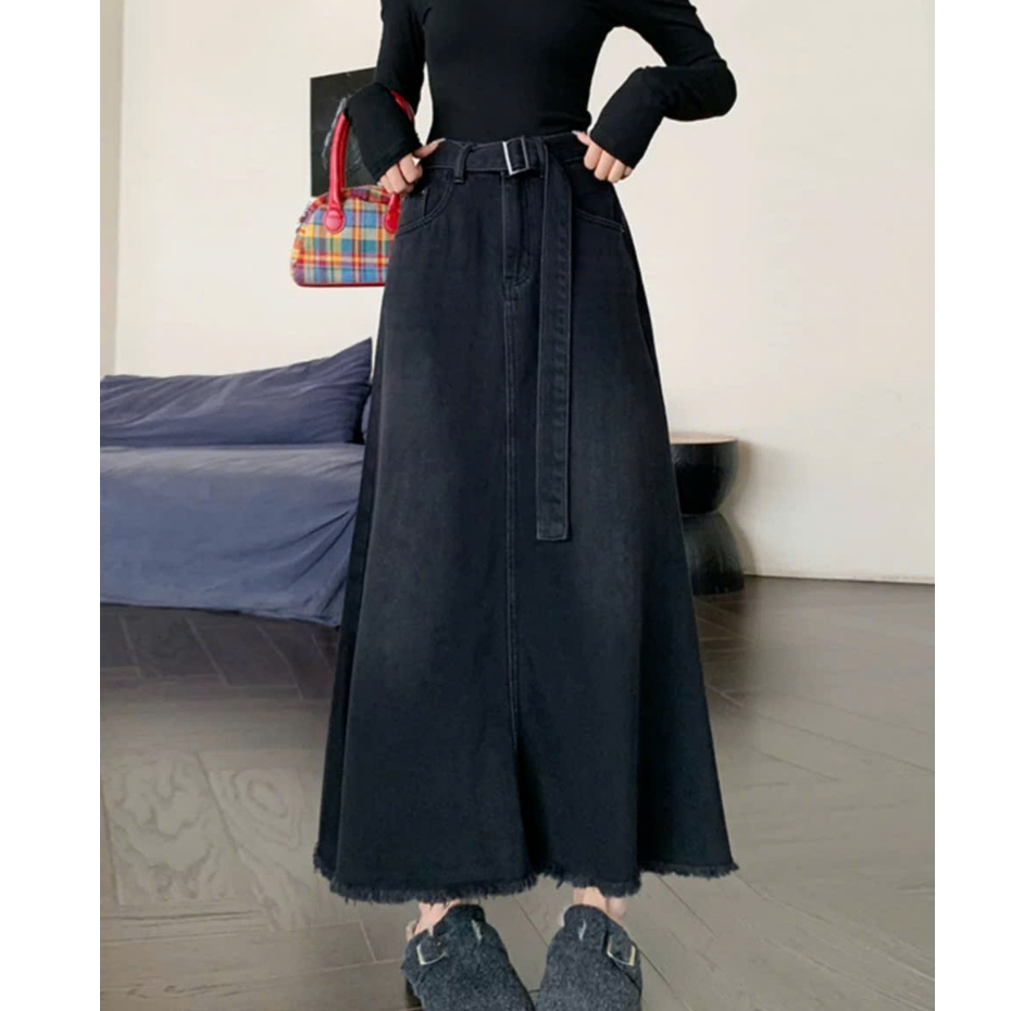 Chân váy jean nữ dài cạp cao tua gấu tặng kèm đai, chân váy midi dáng chữ A kiểu dáng thanh lịch_A43