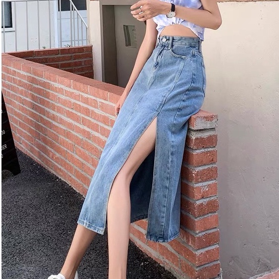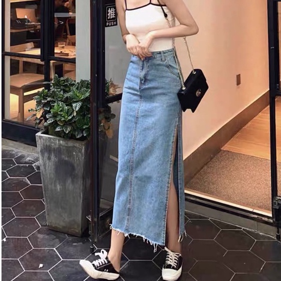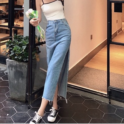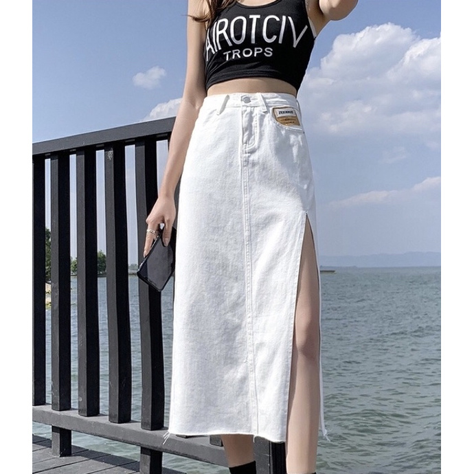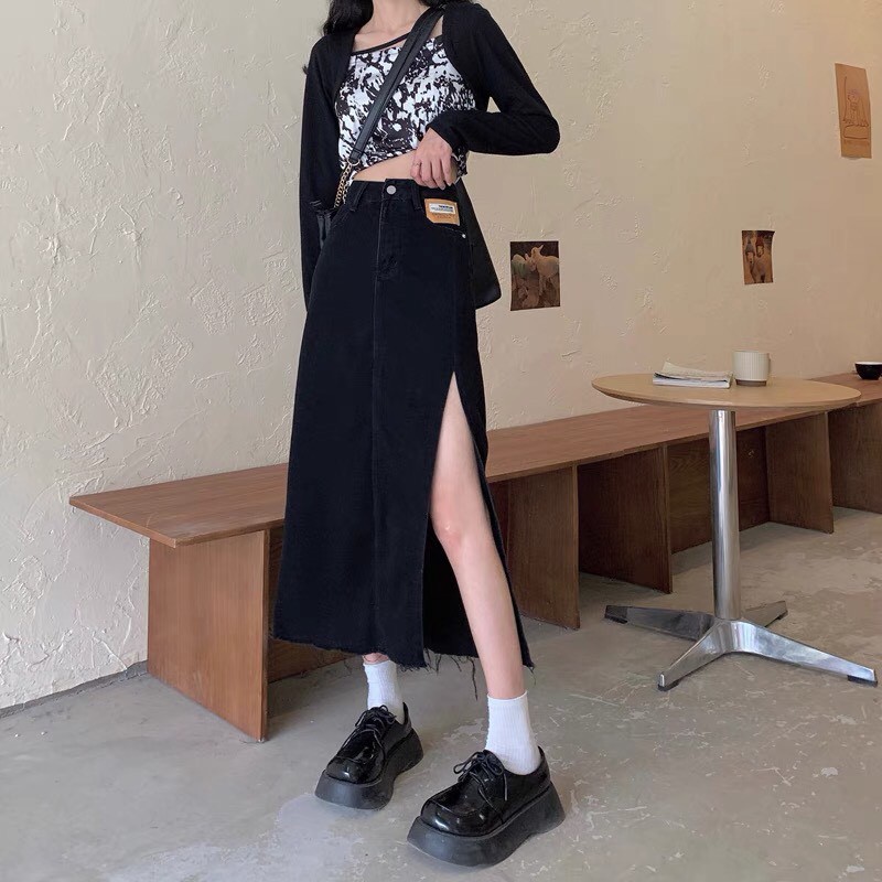Chân Váy Xẻ Dài Qua Gối Cạp Cao Tua Gấu Phong Cách Hàn Quốc_A2