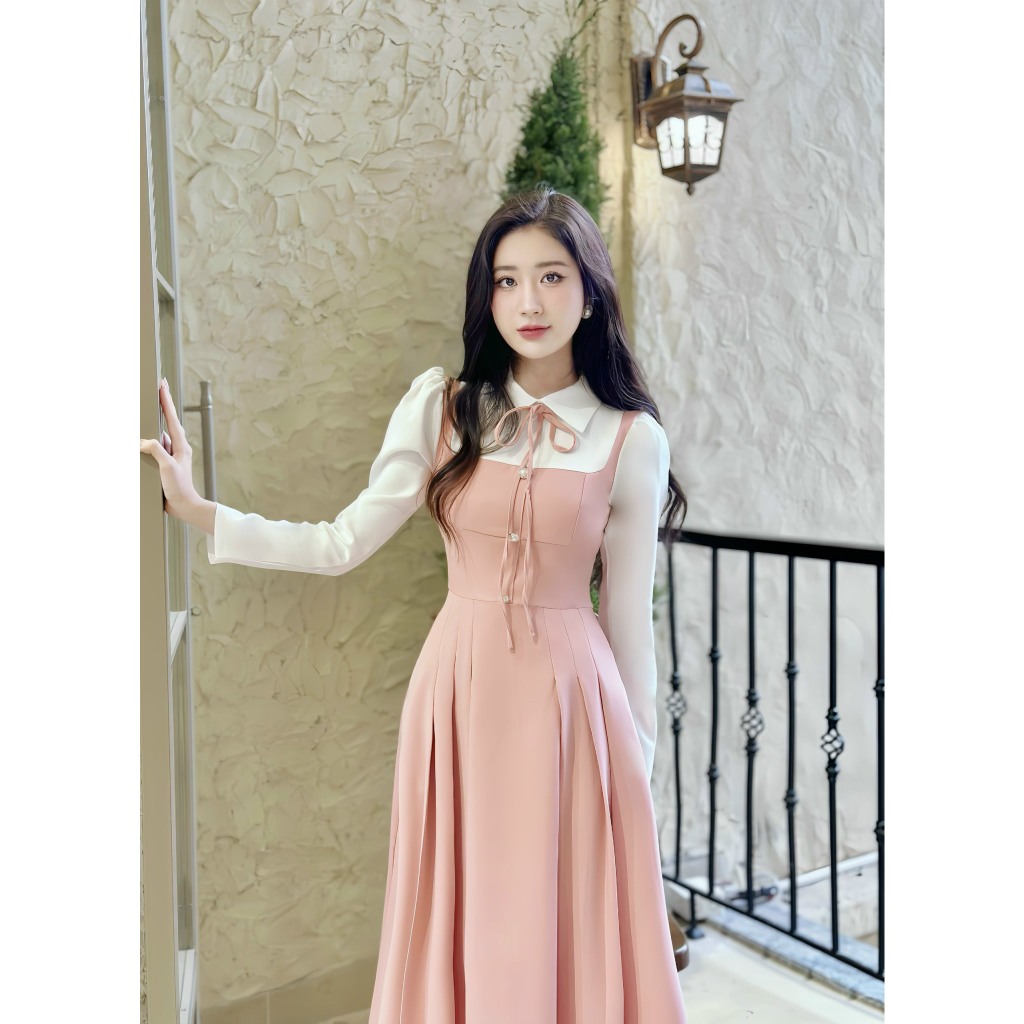váy tuyết mưa hồng cao cấp nơ buộc dài tay, đầm nơ hồng xinh xắn phù hợp đi chơi, đi làm đi tiệc du lịch hẹn hò đều xinh