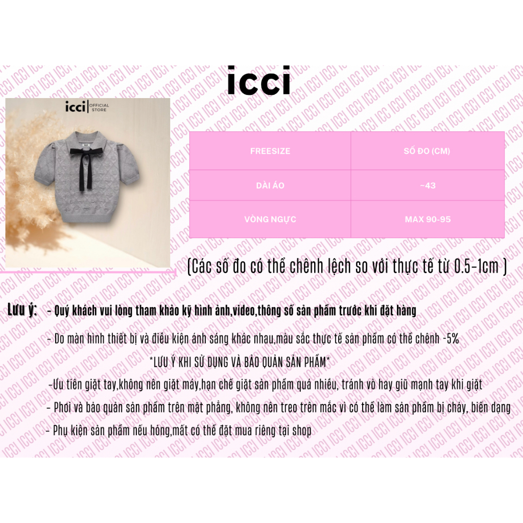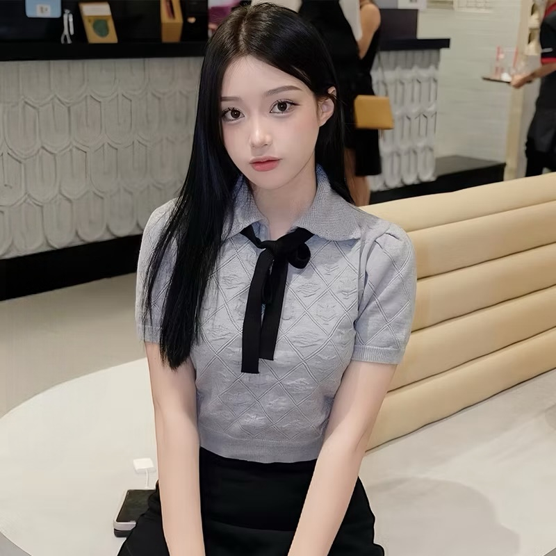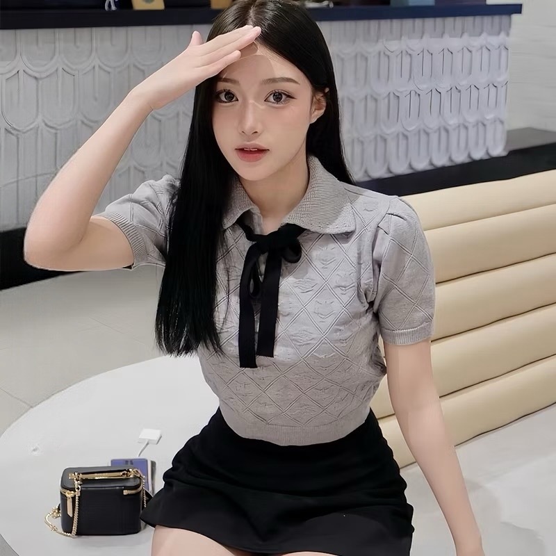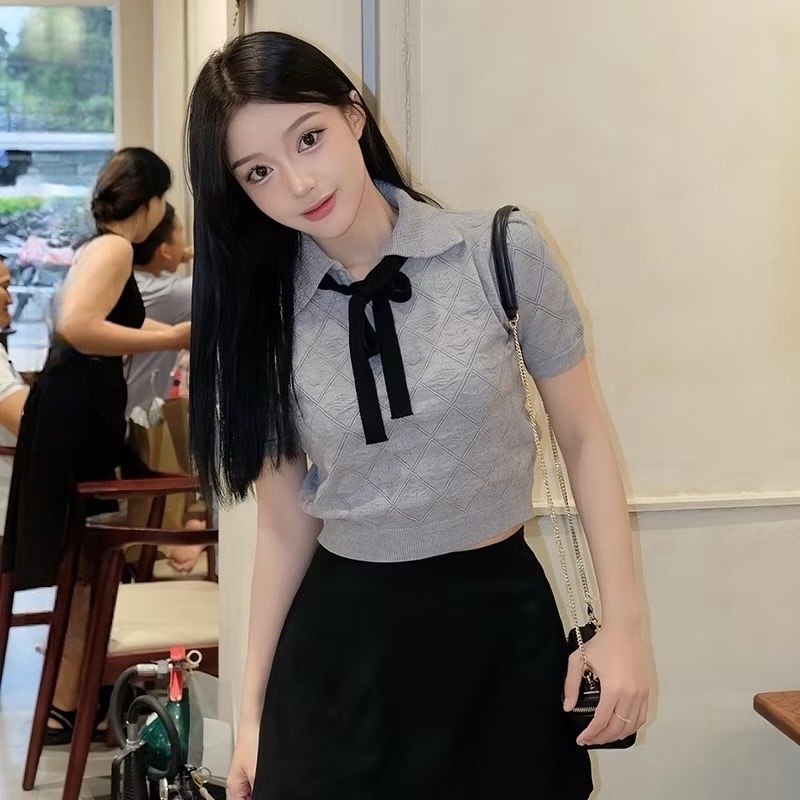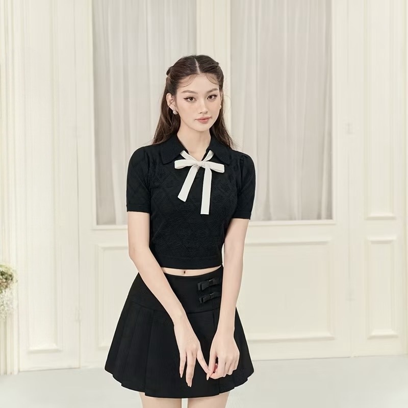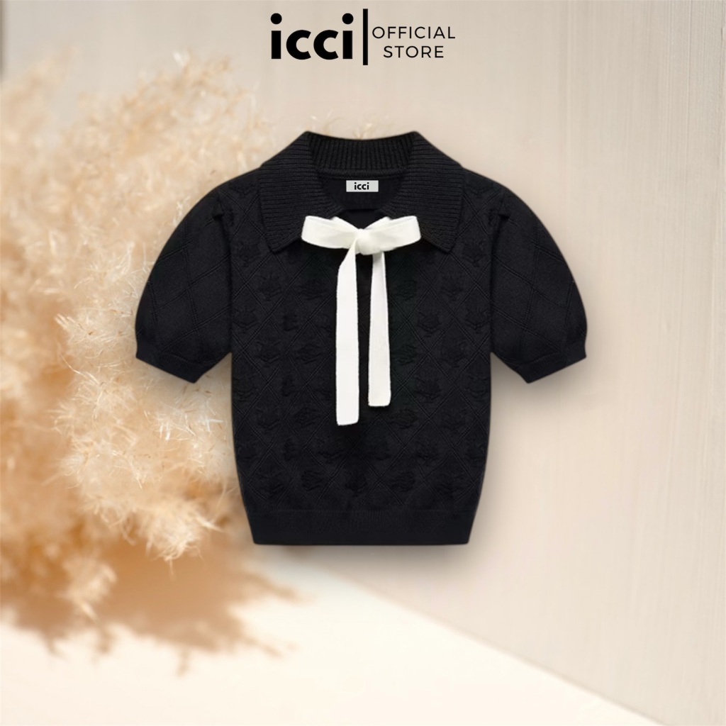 ICCI - Áo len croptop tay ngắn buộc nơ đan hoạ tiết quả trám ICW2