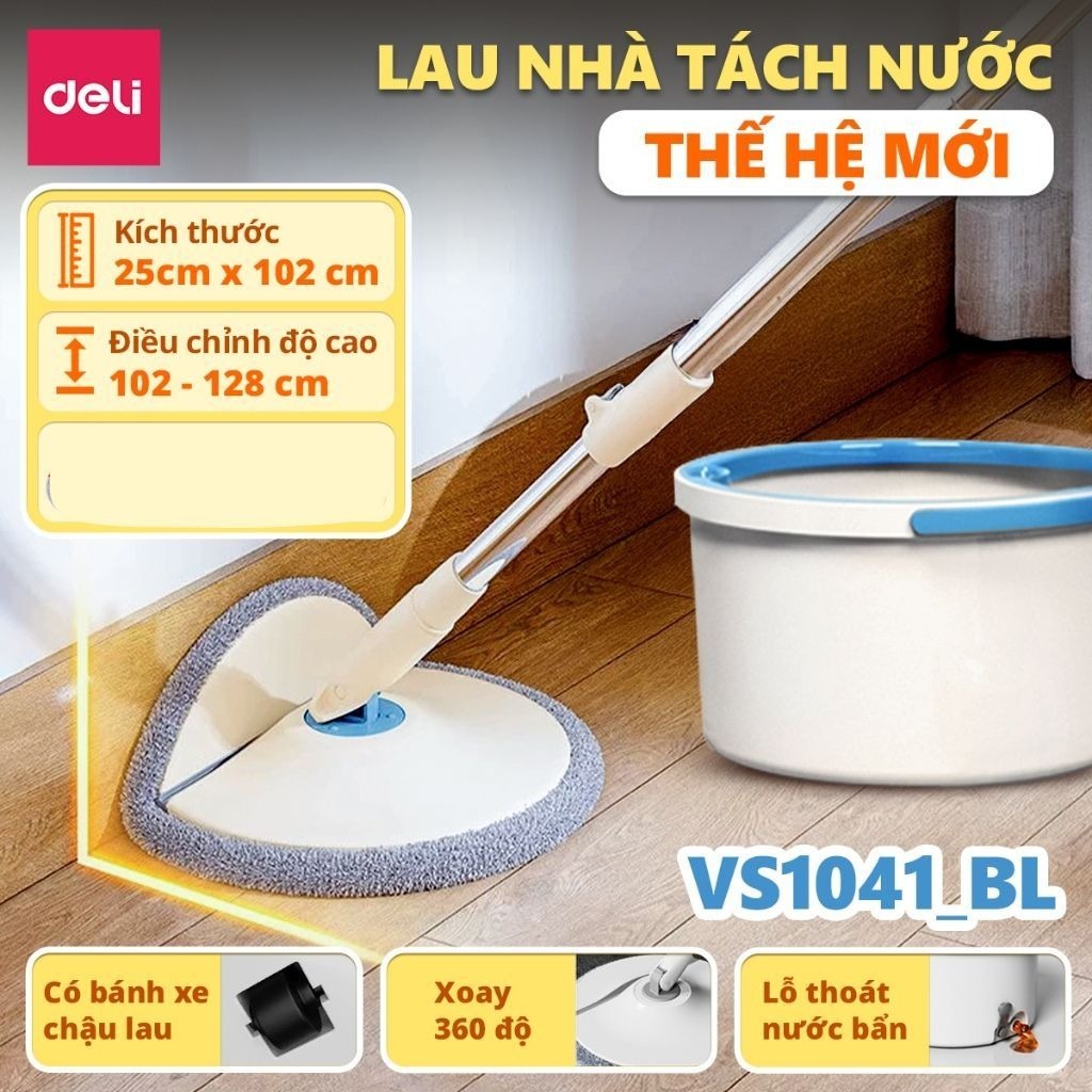 Bộ Cây Lau Nhà Tách Nước Bẩn Thông Minh Deli, Chổi Lau Nhà Xoay 360 độ có 2 Ngăn Kèm TẶNG 1 BÔNG