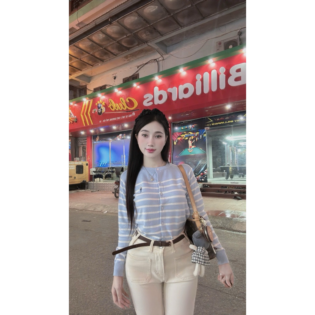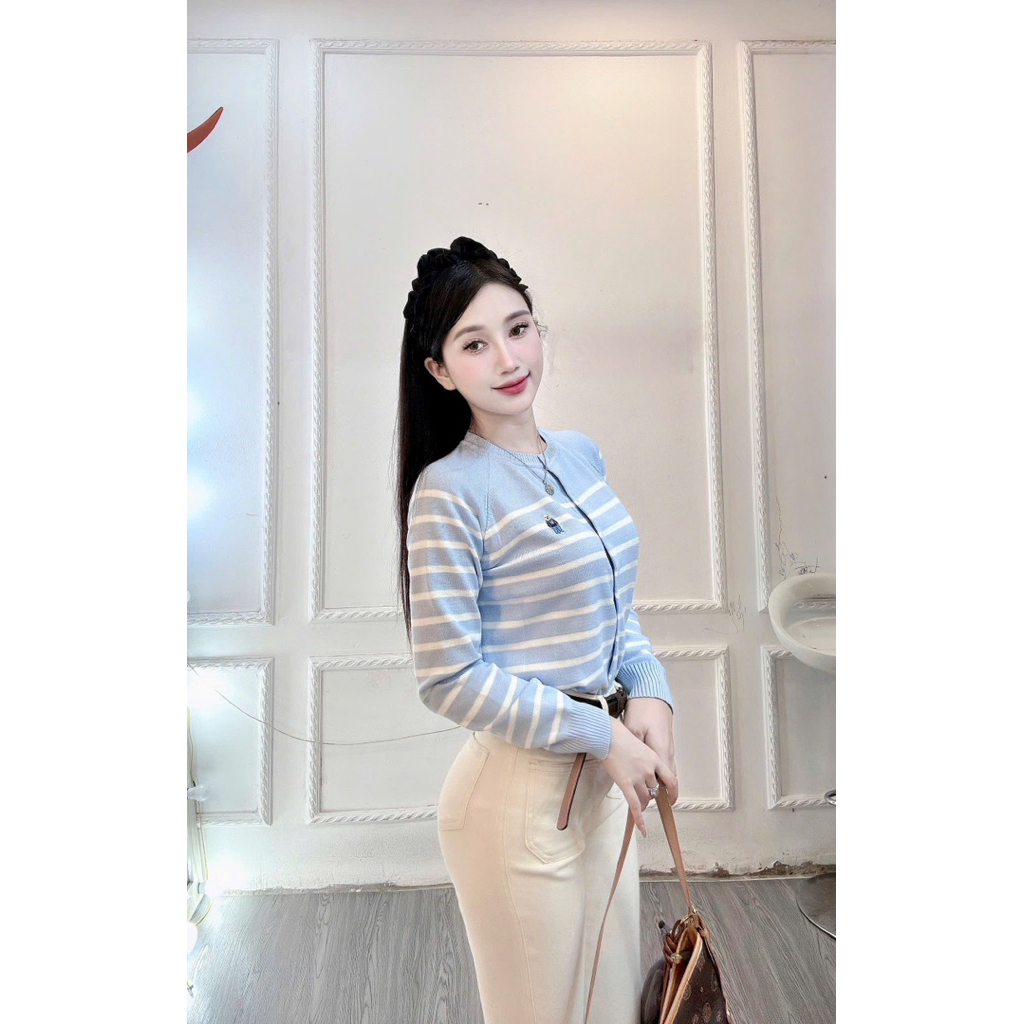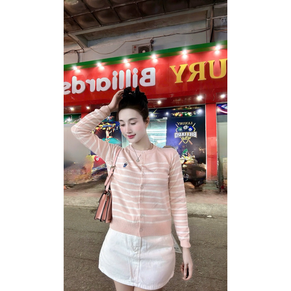 Áo len cardigan nữ dáng vừa thêu gấu sọc ngang dễ thương chất len dày mịn giữ ấm thu đông đủ 6 màu