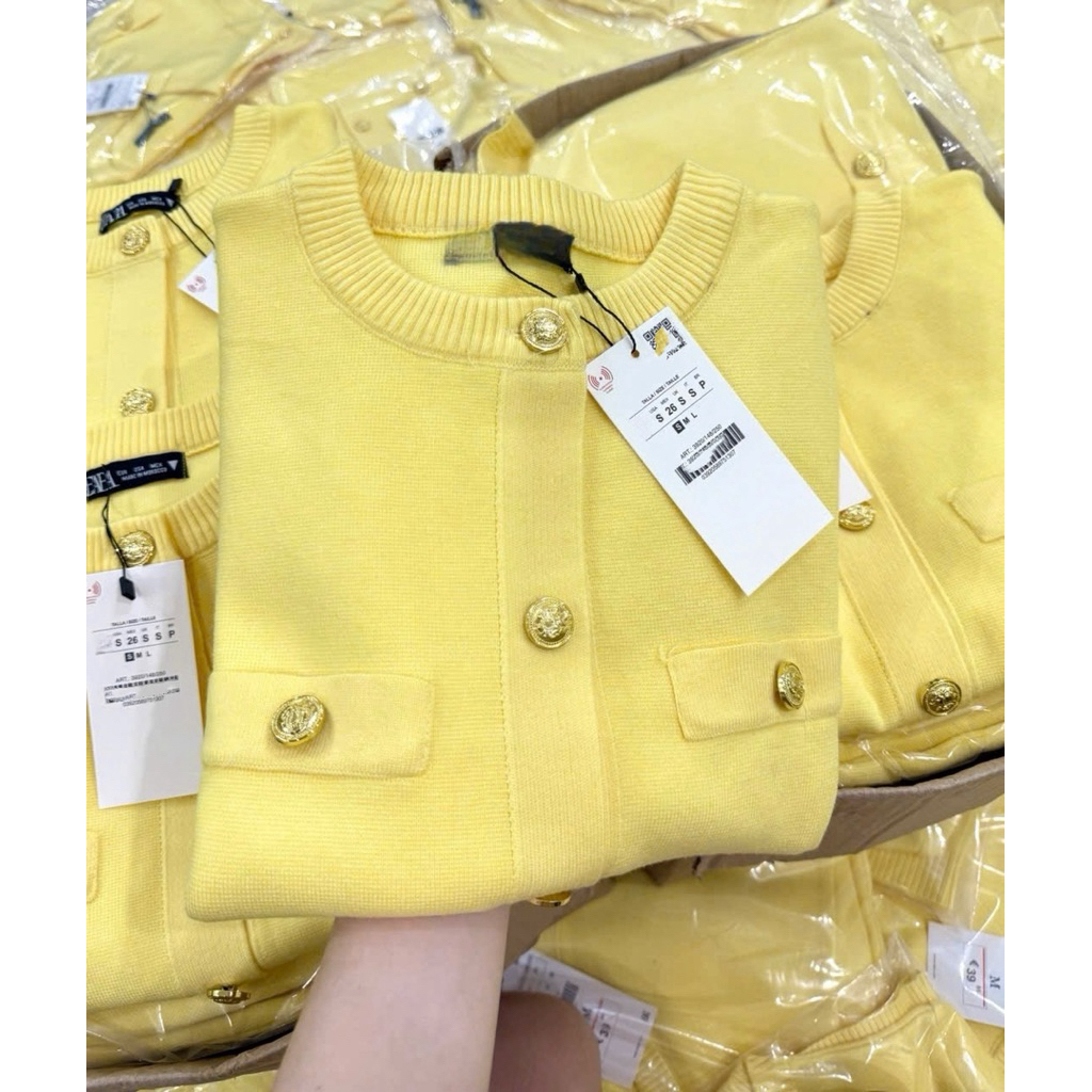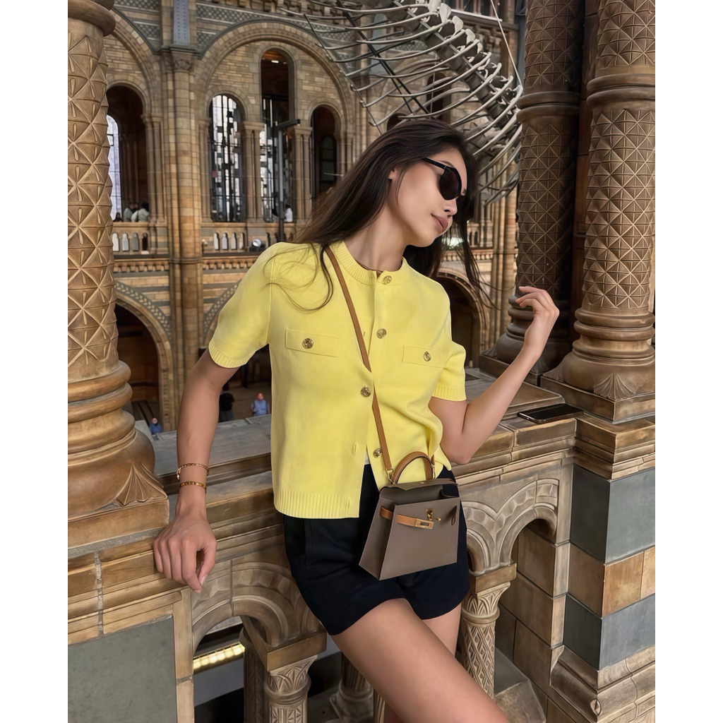 Áo Len Nữ Cardigan Tay Ngắn Túi Giả – Màu Vàng Xinh Xắn, Sang Trọng 2026