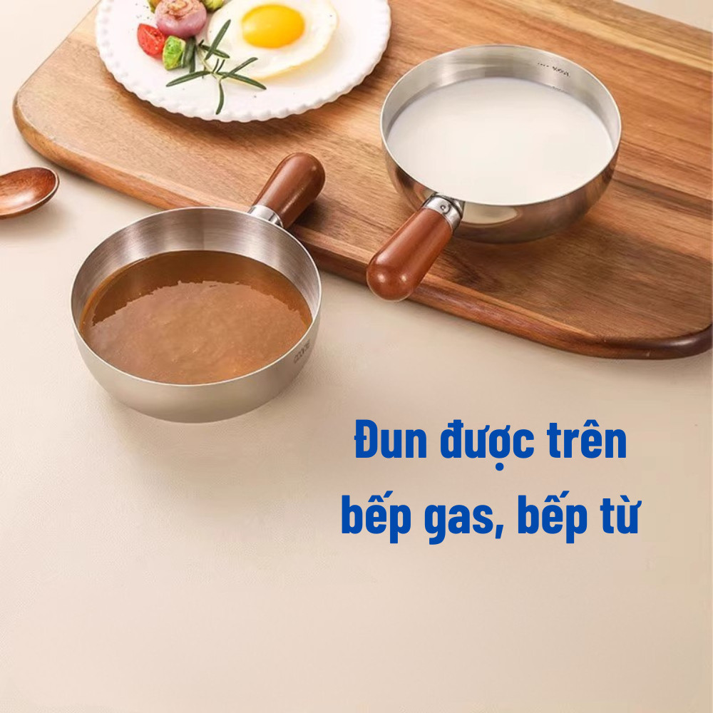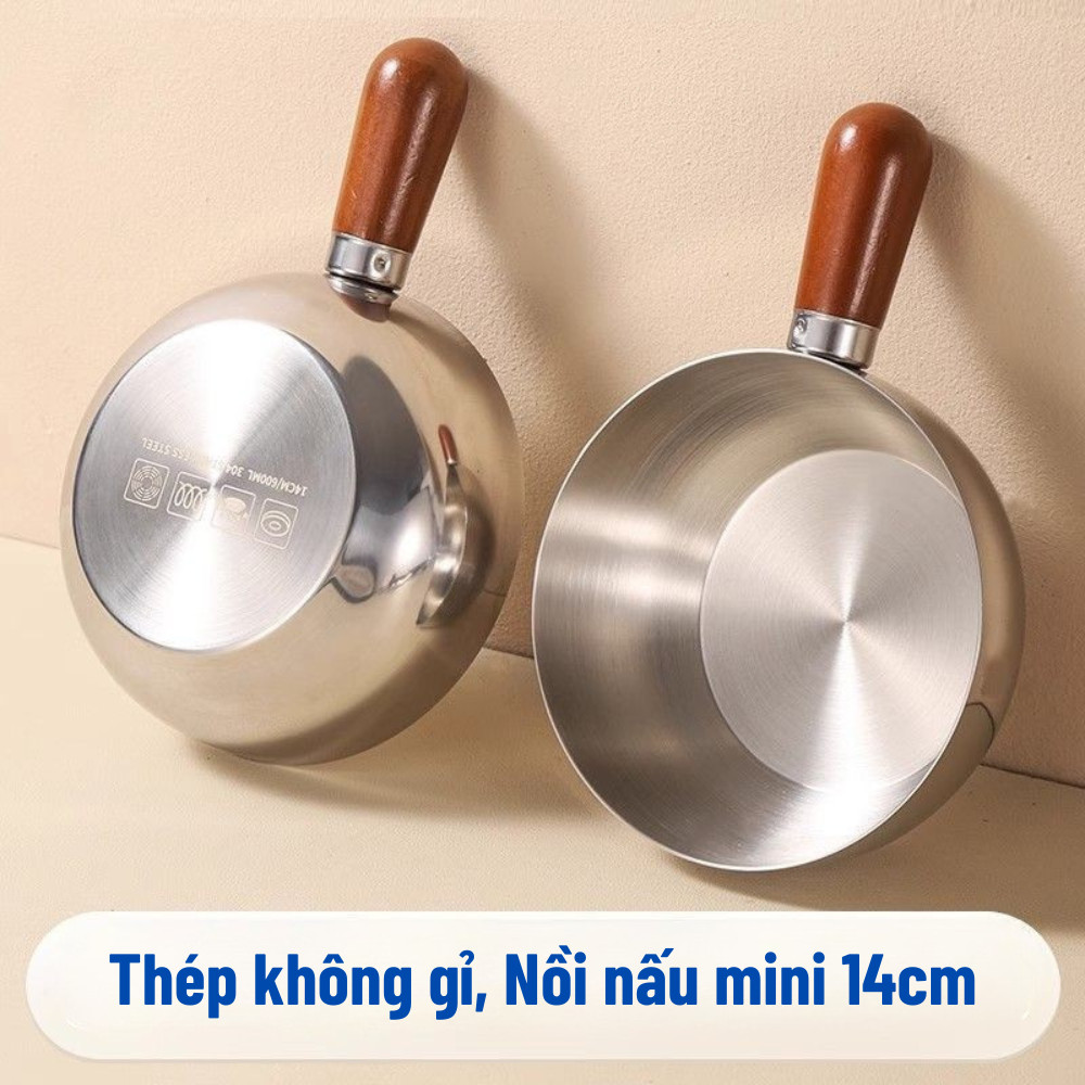 Nồi Mini Inox Cán Gỗ Chống Bỏng, Nồi Nấu Mì, Đun Sữa, Làm Sốt, Dễ Vệ Sinh, Đun Được Bếp Gas, Bếp Từ