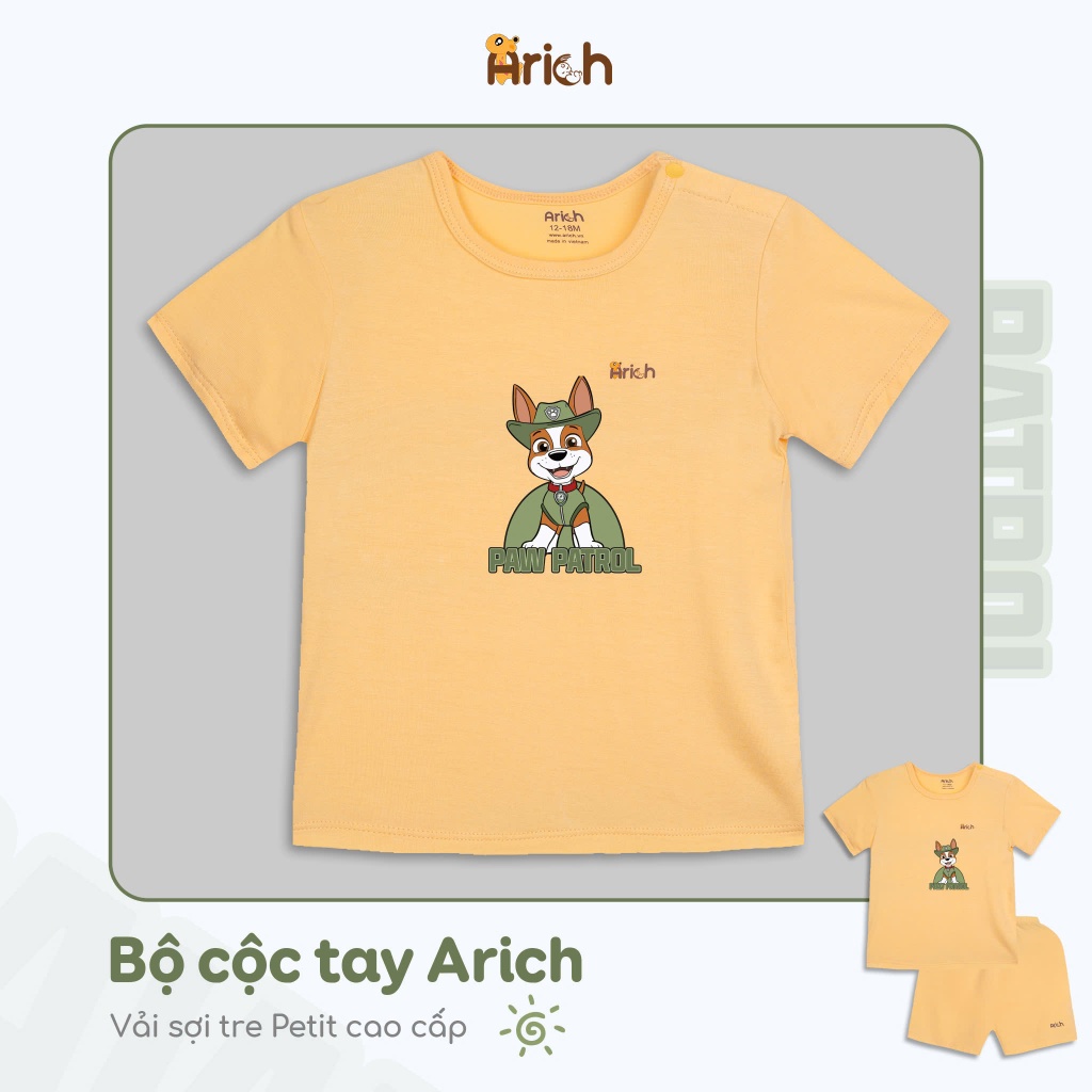Bộ cộc tay cài vai Arich vải sợi tre in Cún Xanh cho bé từ 9 tháng đến 6 tuổi