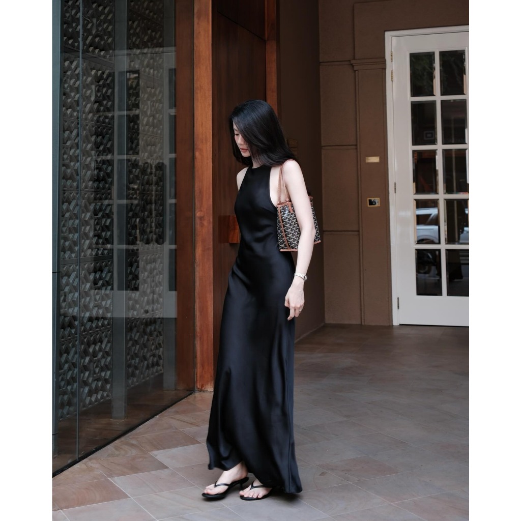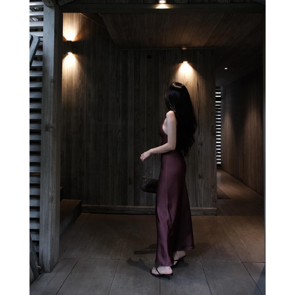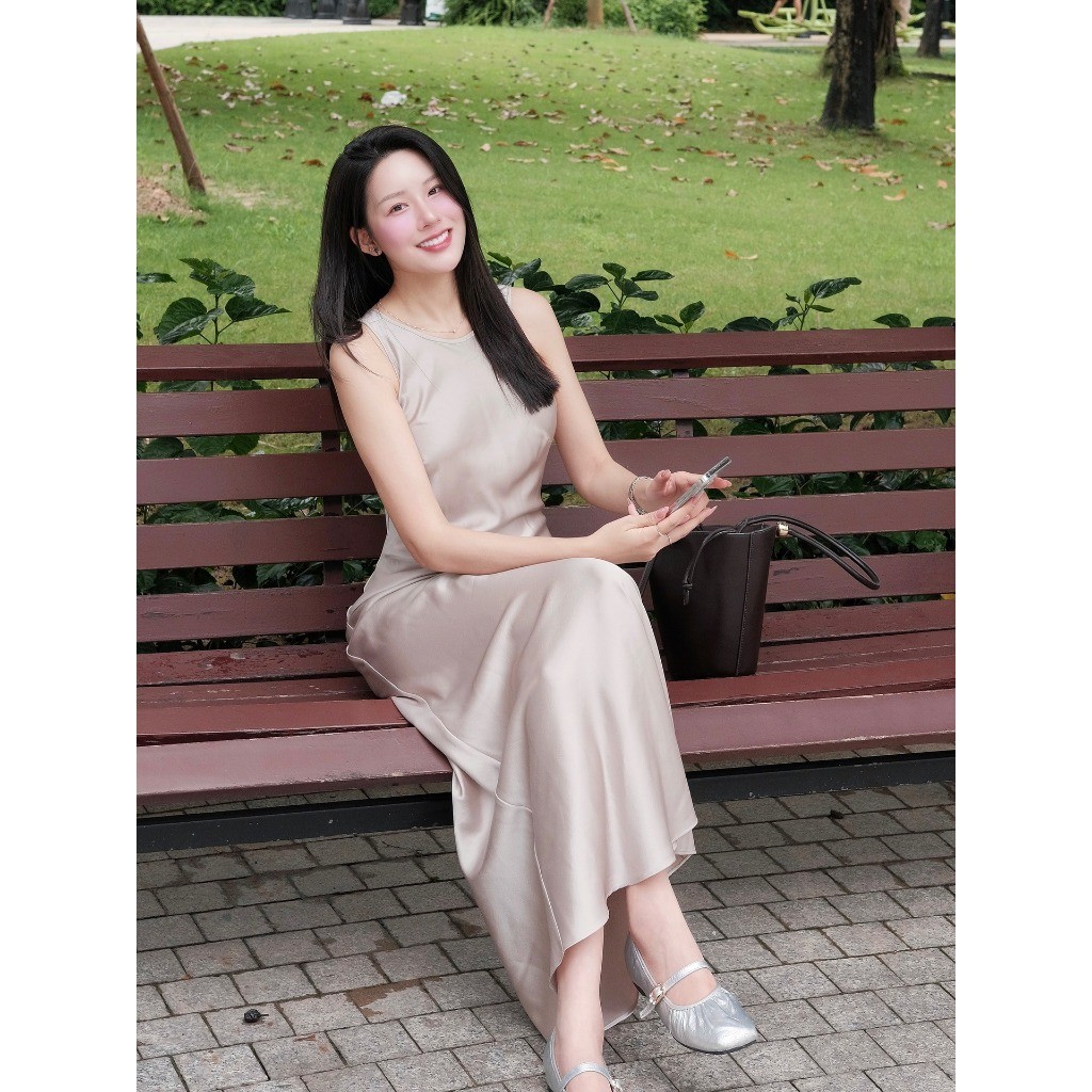 Đầm lụa Váy lụa cổ viền, Váy lụa dáng dài Hàn Châu 1 lớp không mút ngực