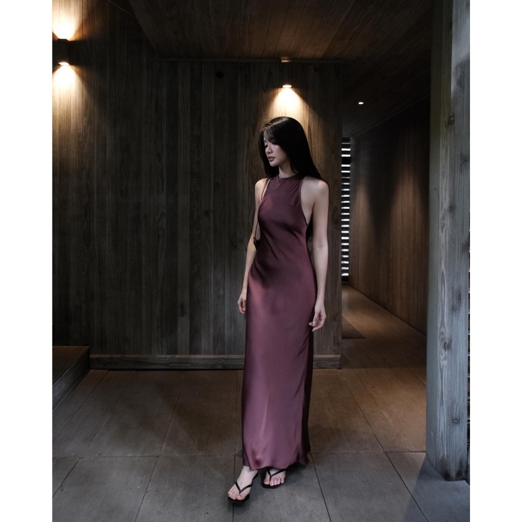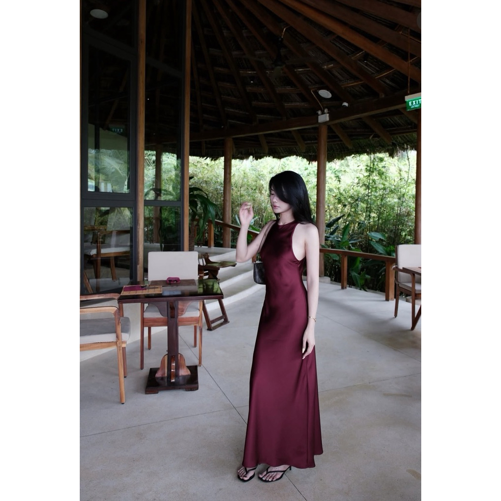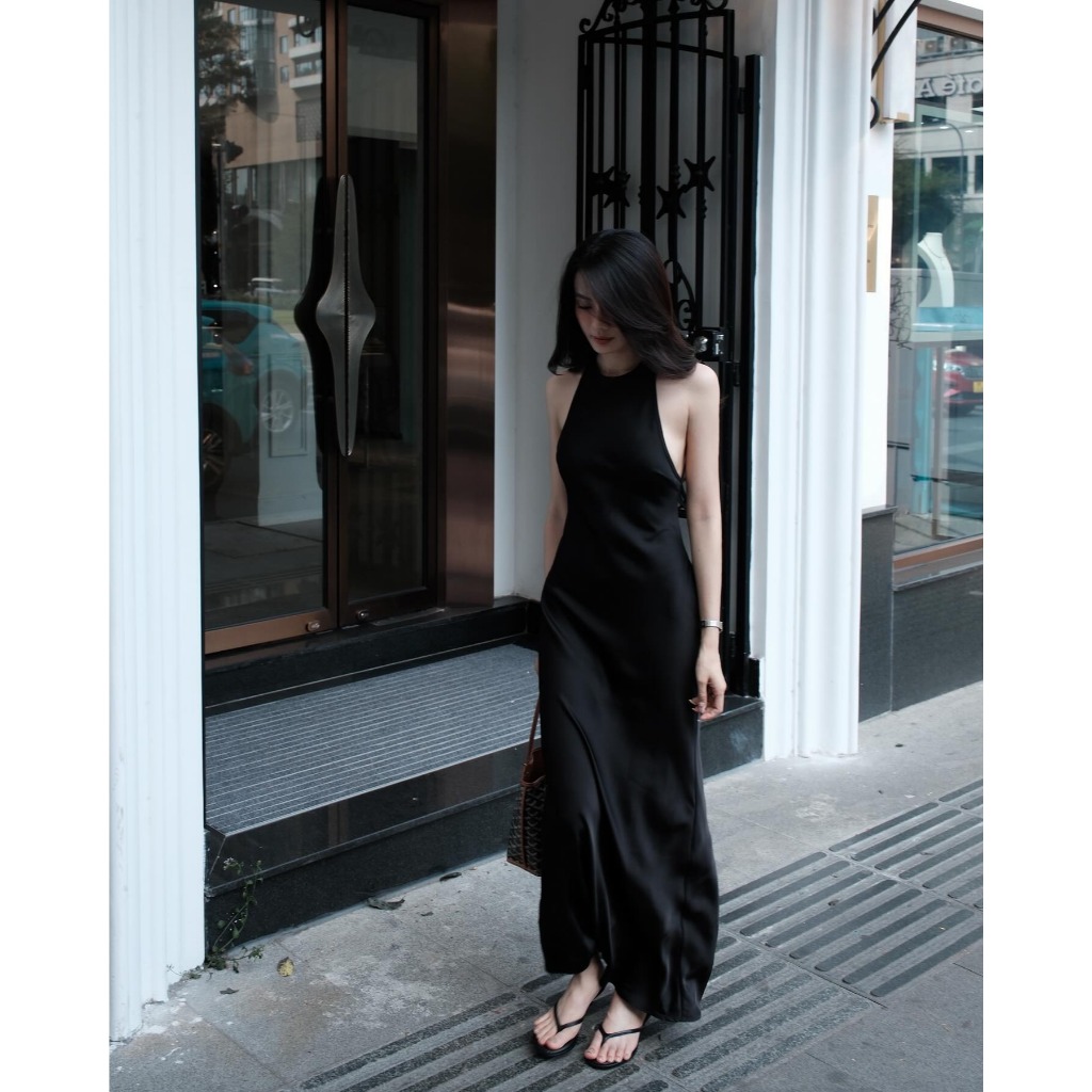 Đầm lụa Váy lụa cổ viền, Váy lụa dáng dài Hàn Châu 1 lớp không mút ngực
