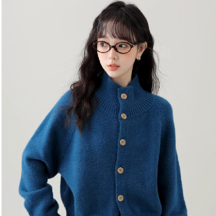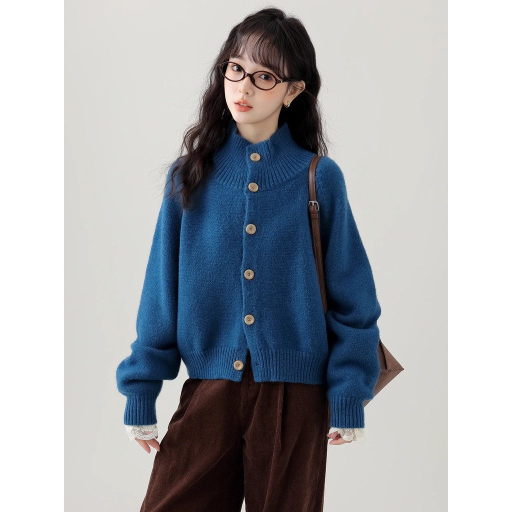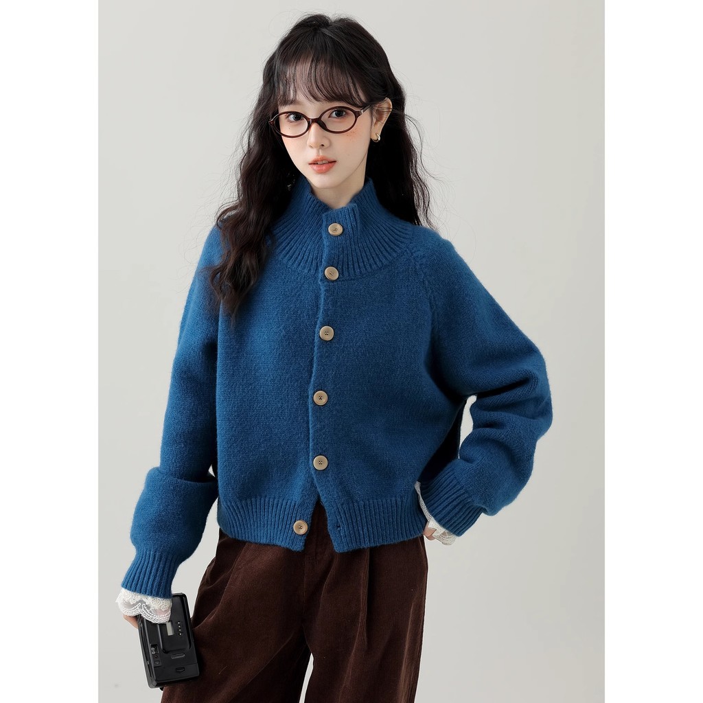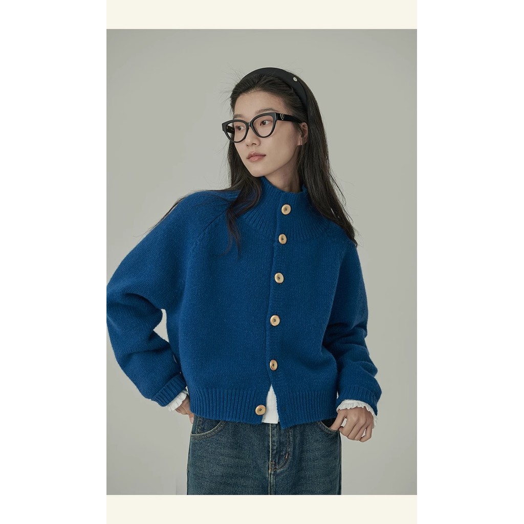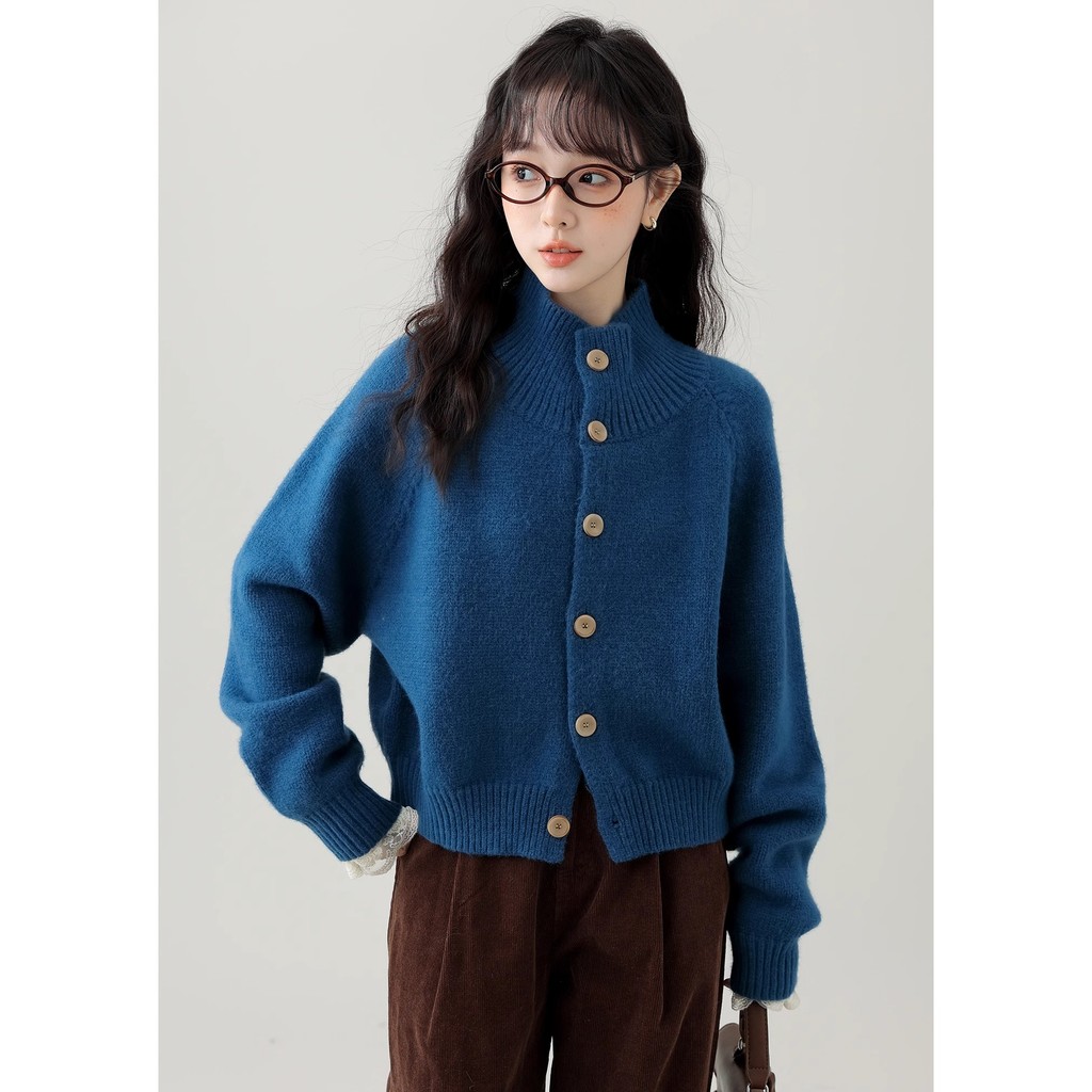 Kii Wii Áo len dệt kim ngắn cổ đứng rộng màu trơn mùa thu dành cho nữ 241109