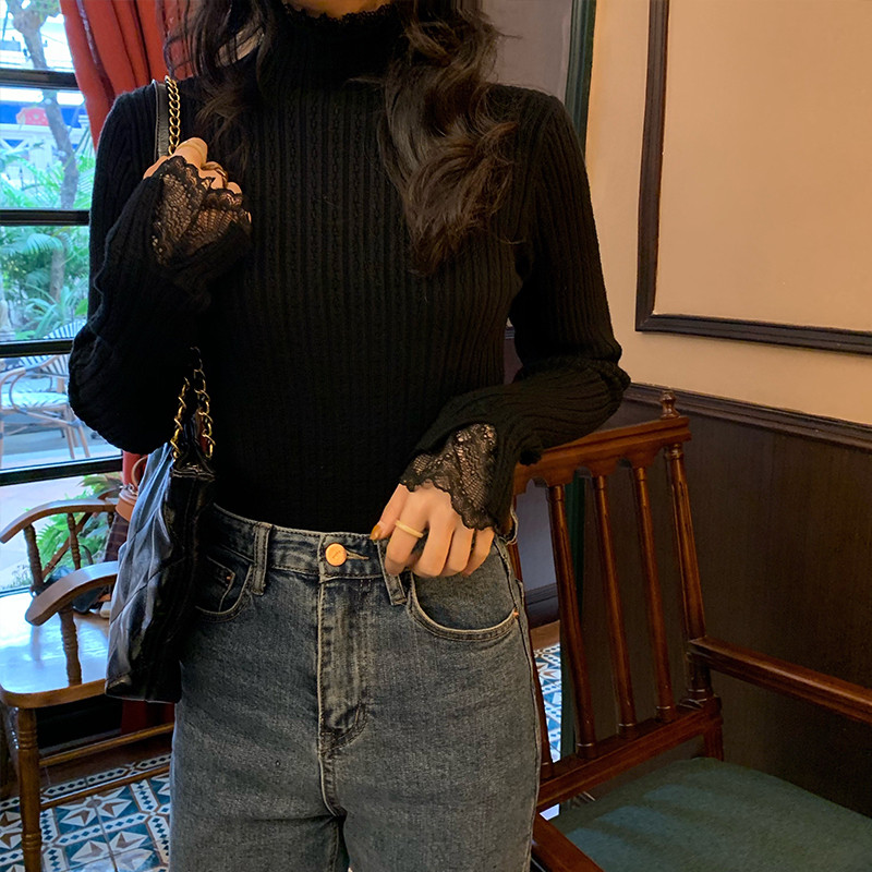 Kii Wii Áo len dệt kim dài tay ren chắp vá nửa cổ cao mùa thu Hàn Quốc 241028