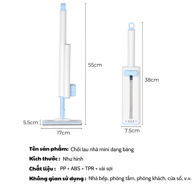 Cây lau đa năng mini tự vắt, đầu xoay 180 độ lau bàn bếp, phòng tắm, lau kính kèm 2 bông lau