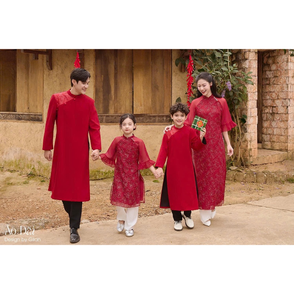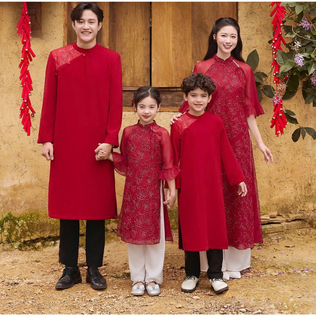 Áo Dài Gia Đình Áo Dài Tết Cách Tân May Sẵn Sắc Đỏ Tài Lộc 4 Tà Lụa Cao Cấp Trẻ Trung Xinh Đẹp