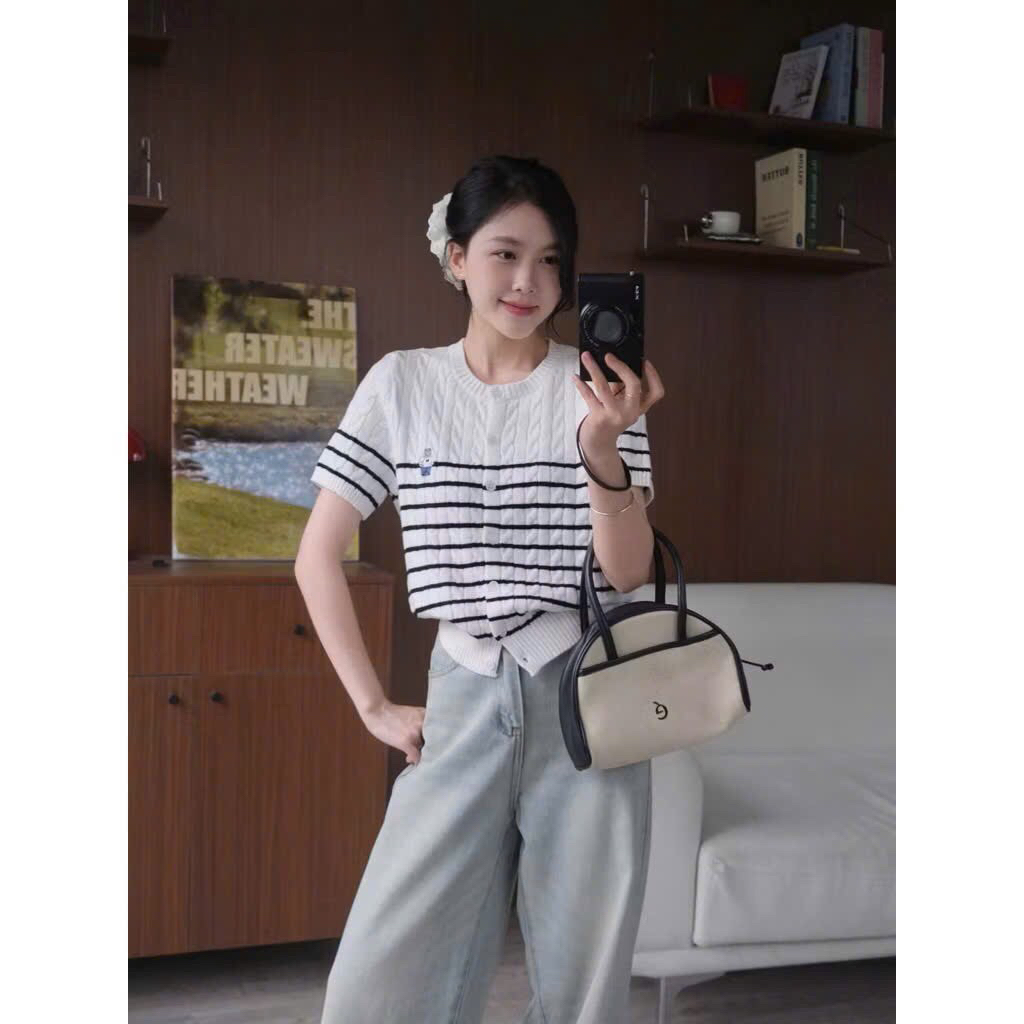 Áo len cộc KẺ THÊU GẤU đứng cài khuy chất len mềm QC.