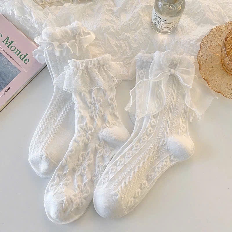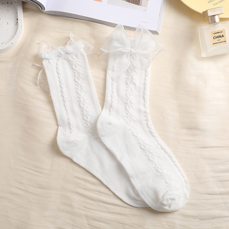 🍑coco🍑Tất vớ cao cổ nữ phối ren đính nơ Jengiang cotton co giãn thoáng khí phong cách nữ sinh lolita y2k Nhật Bản