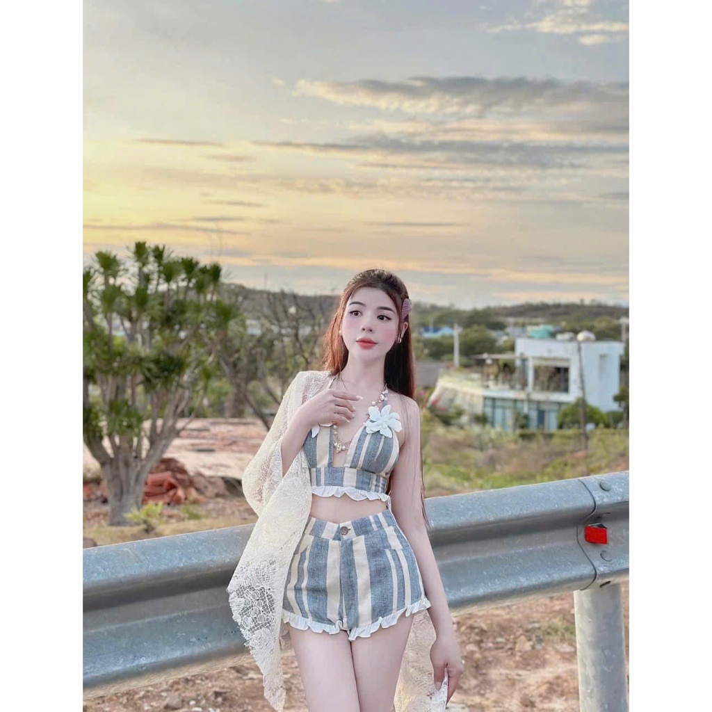 Sét 3 món bikini đi biển xu hướng năm nay sét kaki sọc áo bra cổ yếm đính hoa 2 bên phối quần đùi lai bèo kèm khăn ren