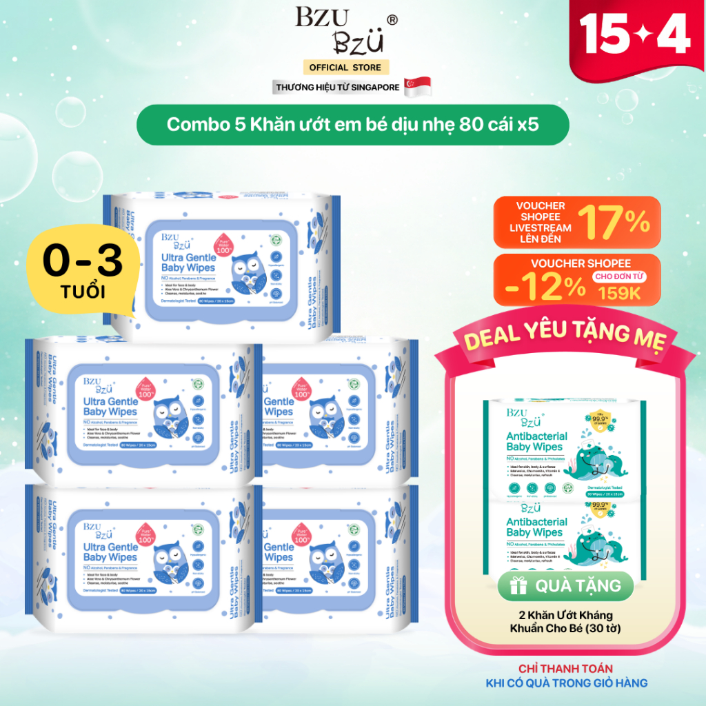 Combo 5 Khăn Ướt 80 Tờ Không Cồn, Không Parabens An Toàn Cho Mẹ và Bé BZU BZU Baby Wipes