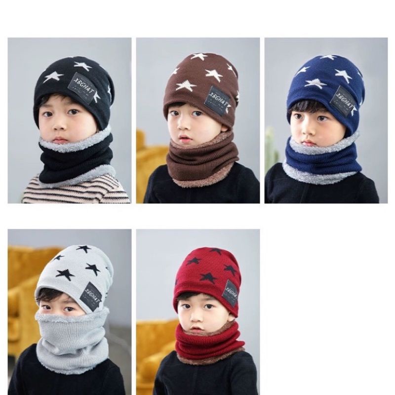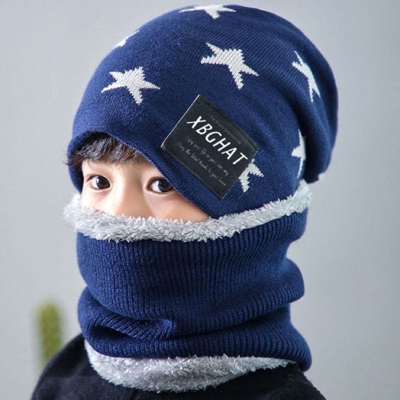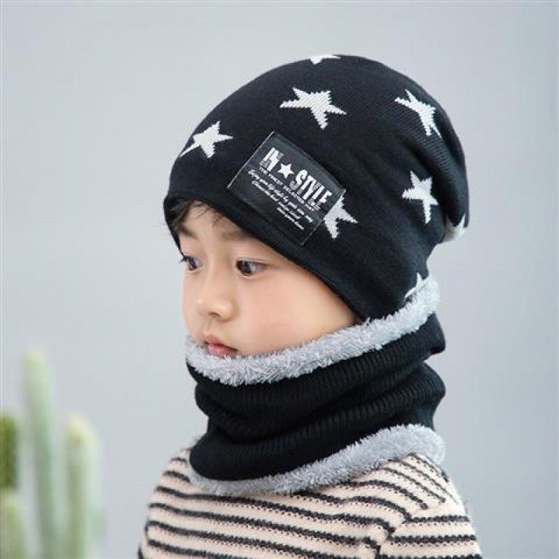 Mũ Len Kèm Khăn Lót Lông Hoạ Tiết Ngôi Sao Siêu Ấm Cho Bé