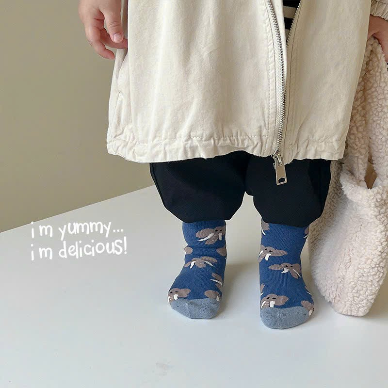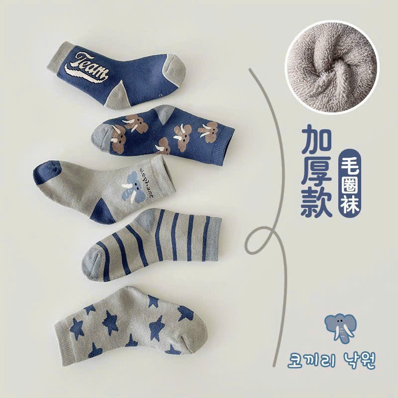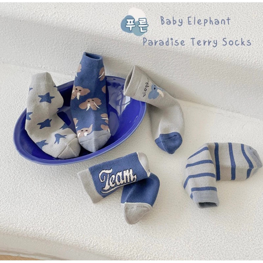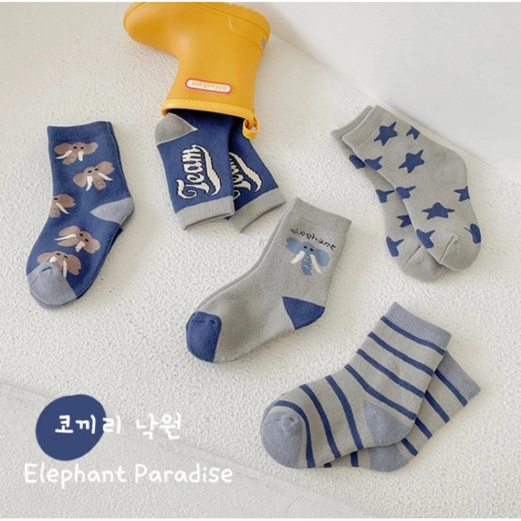 Set 5 Đôi Tất Trẻ Em Cổ Cao Cotton Phối Họa Tiết Voi Xanh