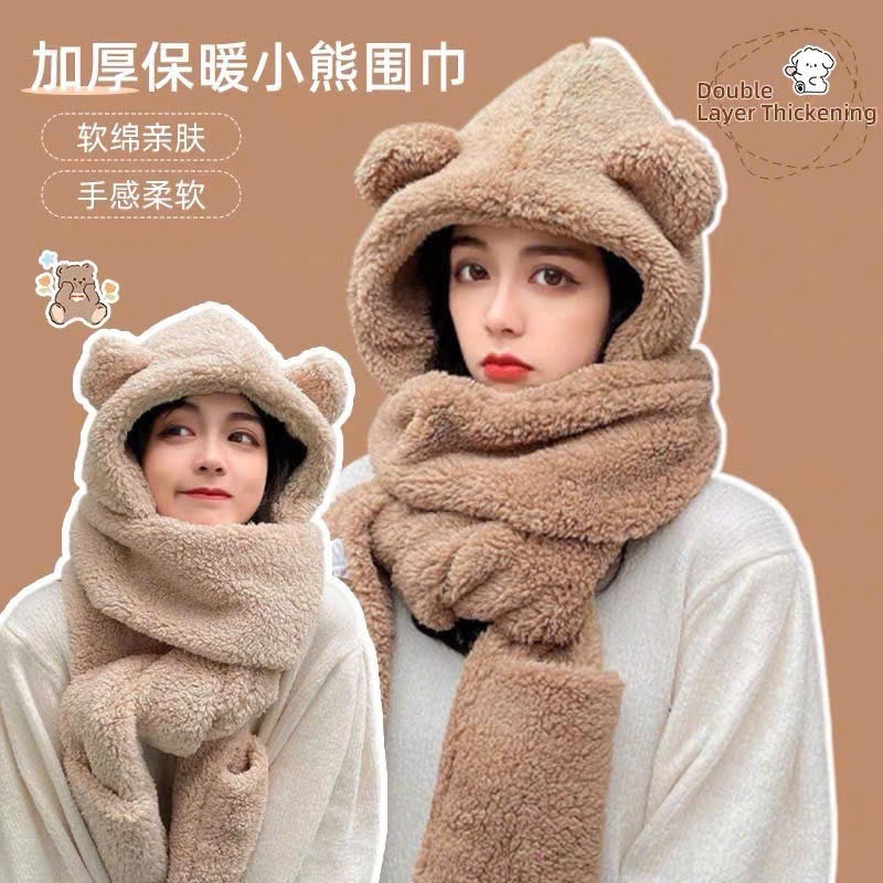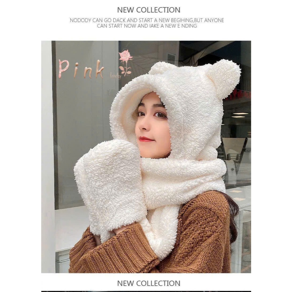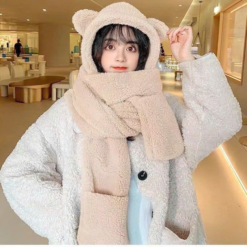 Mũ Len Lông Cừu Trùm Đầu Tai Gấu , Kèm Khăn , Kèm Bao Tay 3 Trong 1 Tiện Lợi Siêu Mềm Mịn Ấm Áp m5