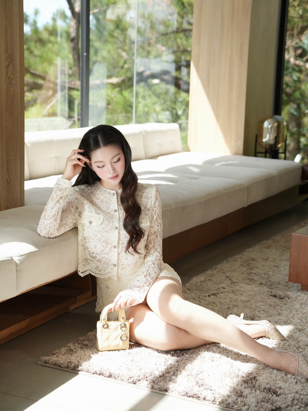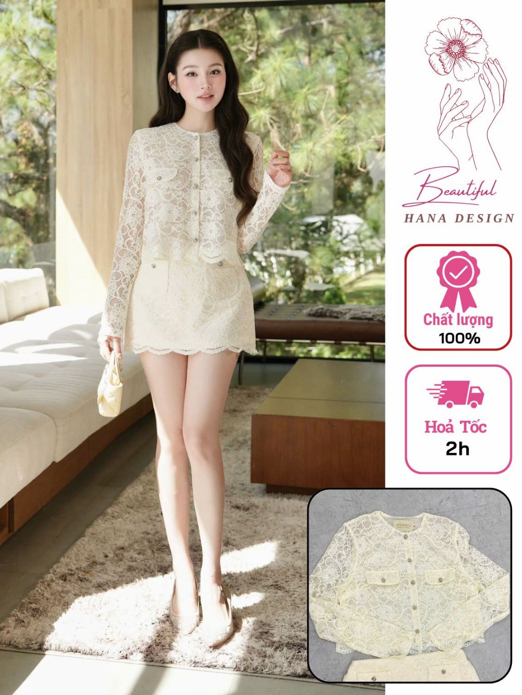 Set Áo Ren Tay Dài Họa Tiết Chuẩn CHOUCHOU Chân Váy Ngắn Sang Chảnh