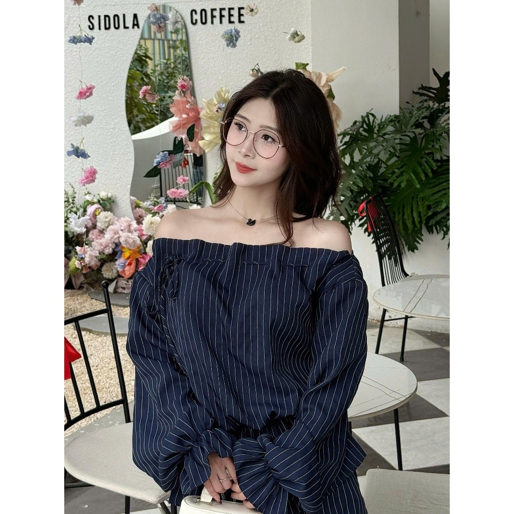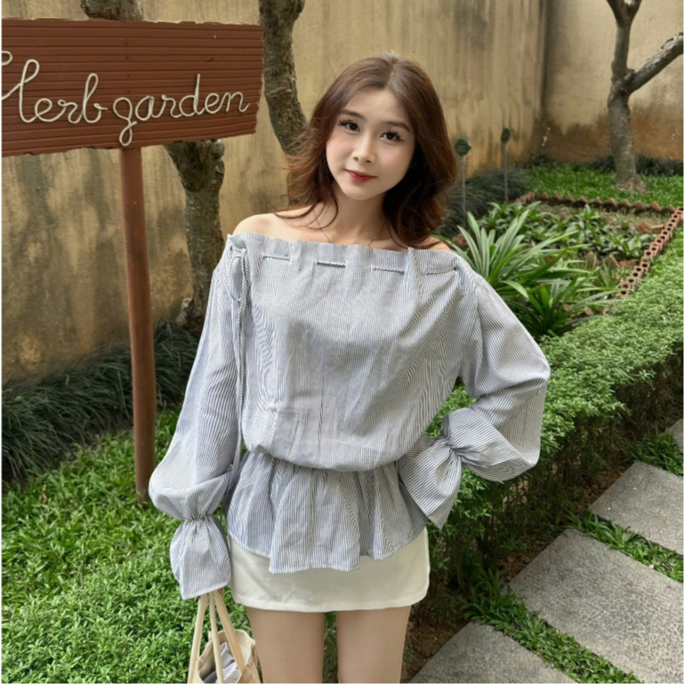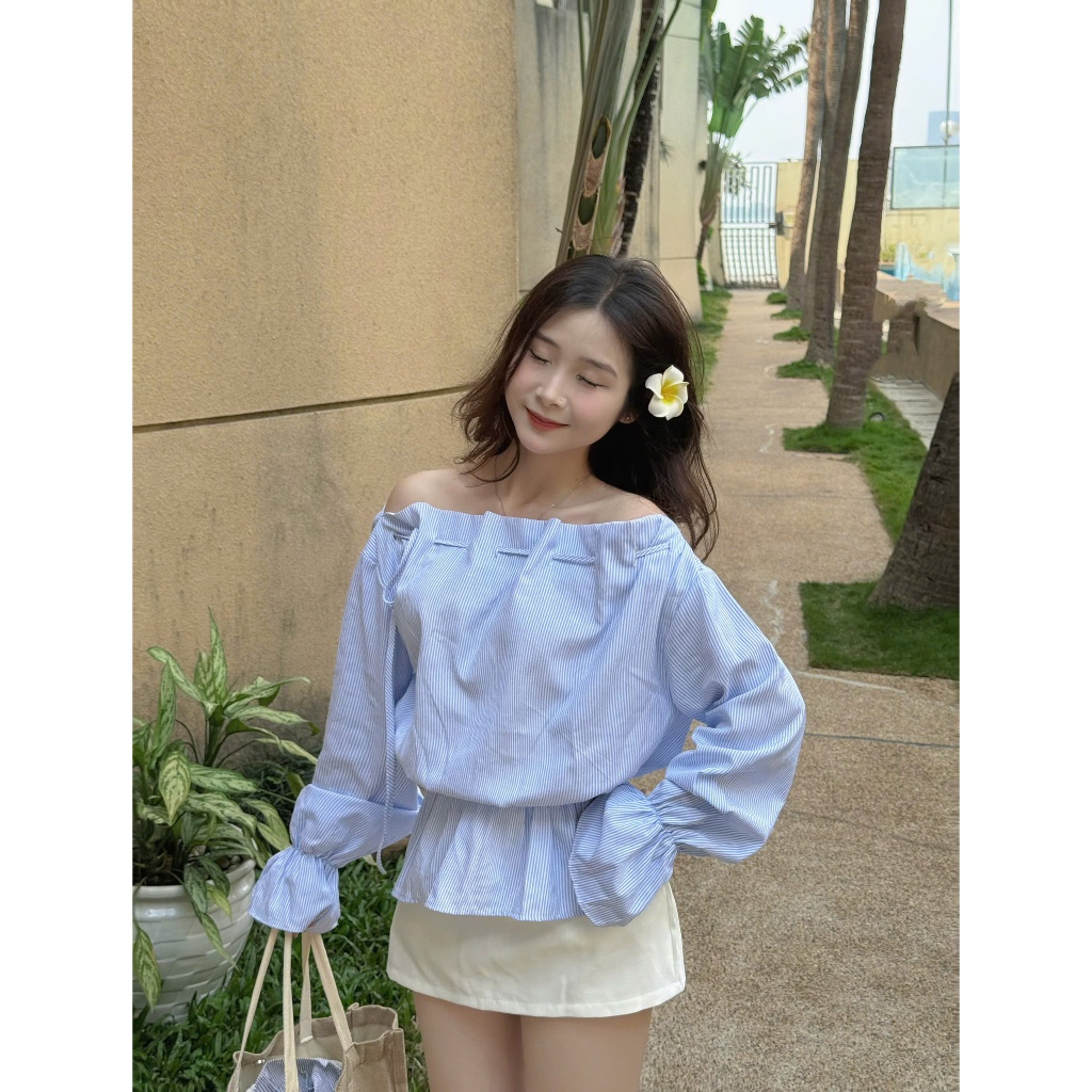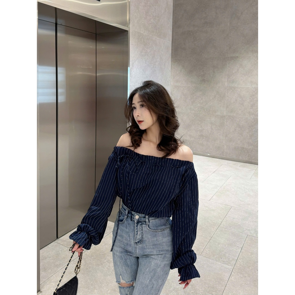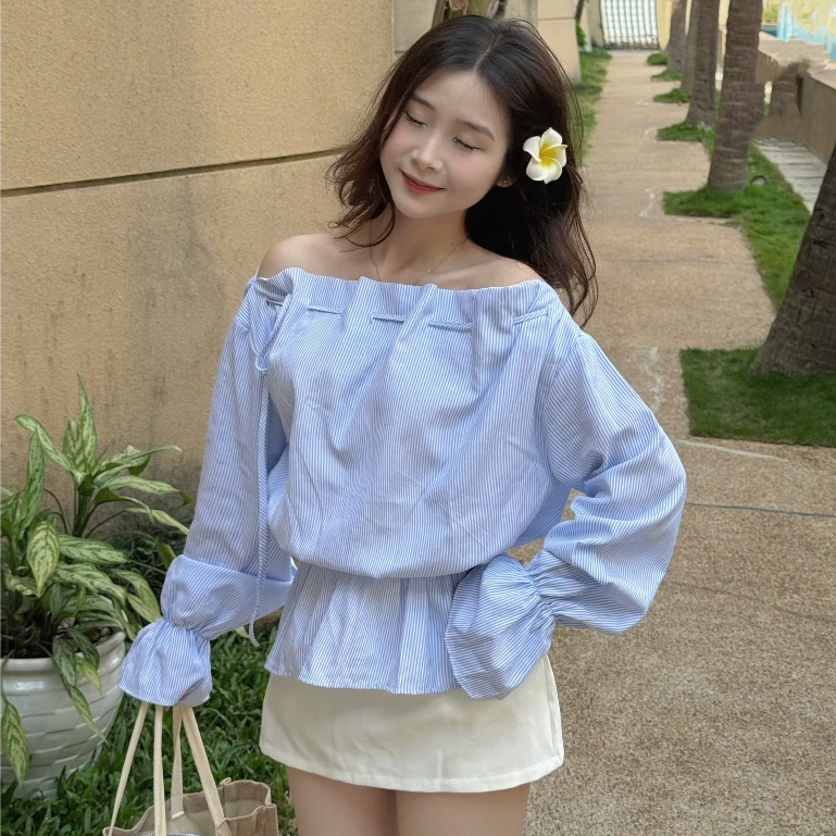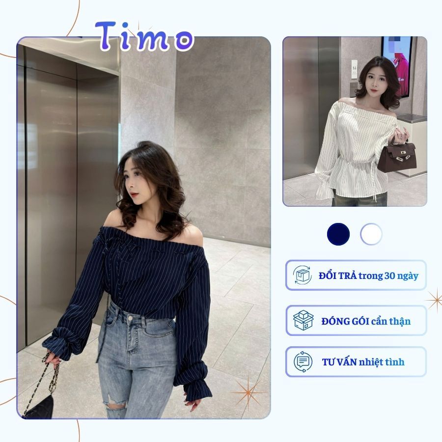 Áo kiểu nữ Timo, Áo sơ mi trễ vai kẻ sọc phong cách thanh lịch chất vải mềm mại thoáng mát AOT208