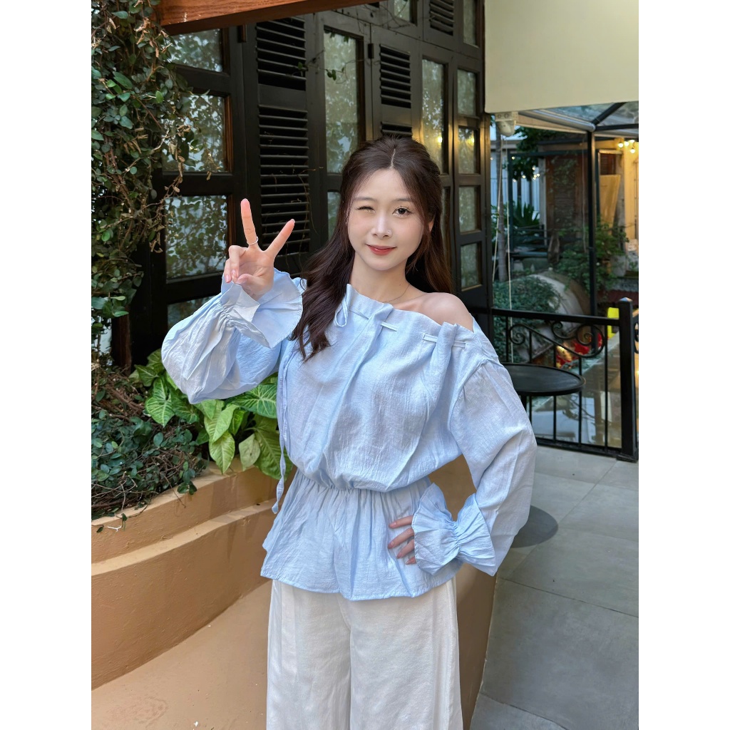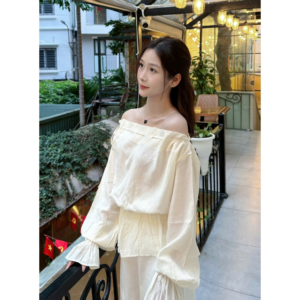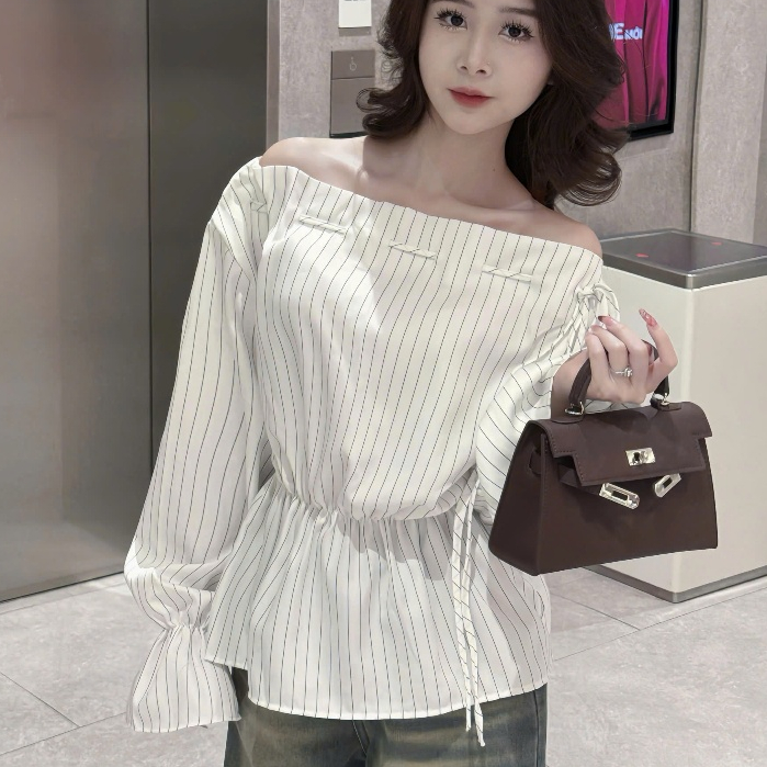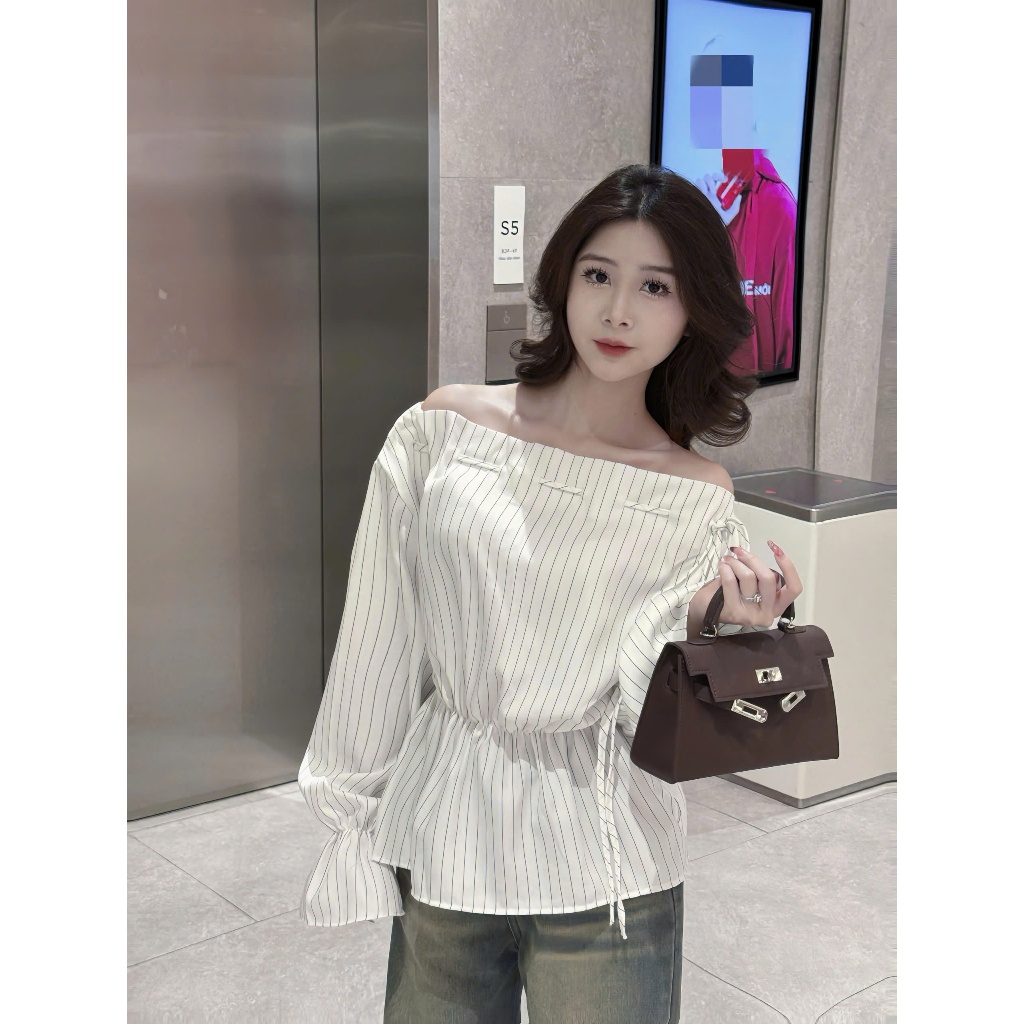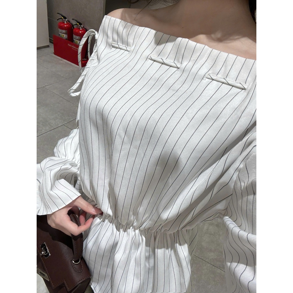 Áo kiểu nữ Timo, Áo sơ mi trễ vai kẻ sọc phong cách thanh lịch chất vải mềm mại thoáng mát AOT208