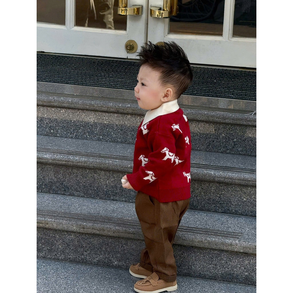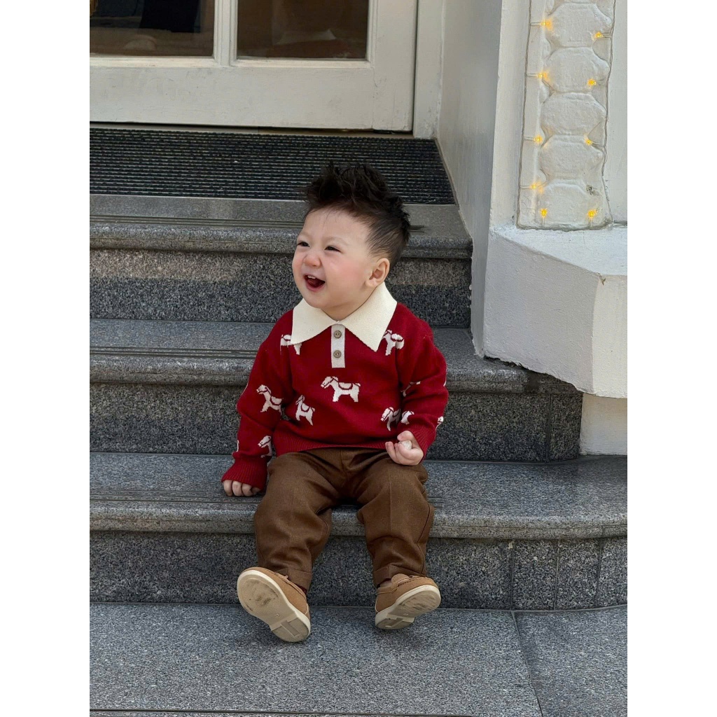 Áo Len Bính Ngọ Cho Bé 8-17kg, Tông Màu Đỏ Đô Phối Hoạ Tiết Chú Ngựa Xinh Xắn Cổ Áo Polo Cúc Gỗ