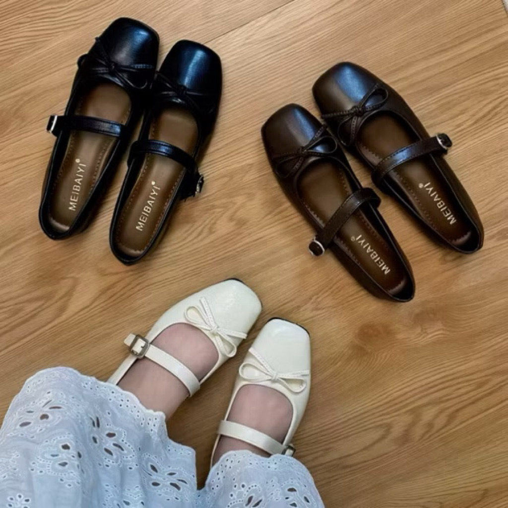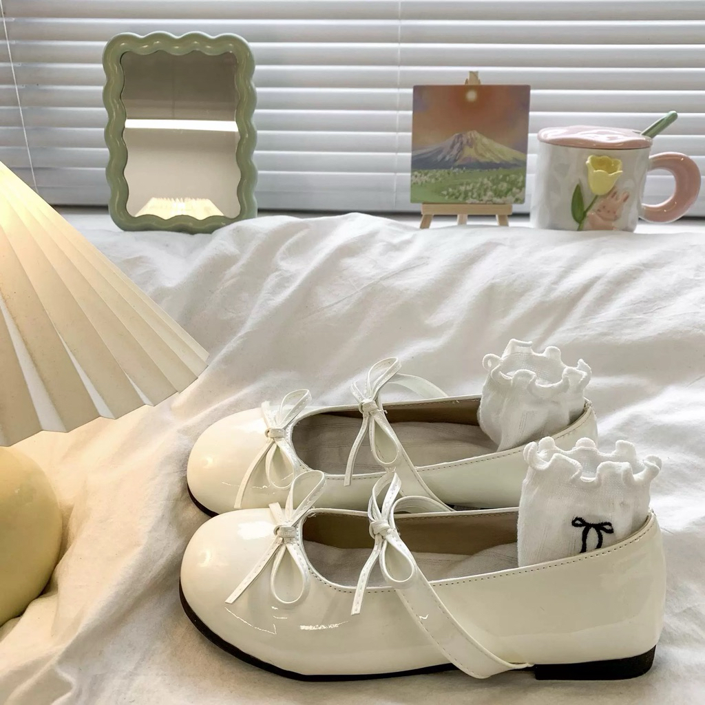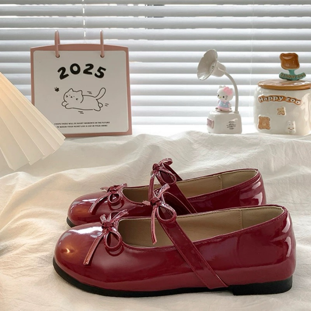 Giày búp bê lolita nữ đế thấp da bóng gắn 2 Nơ thời trang mới