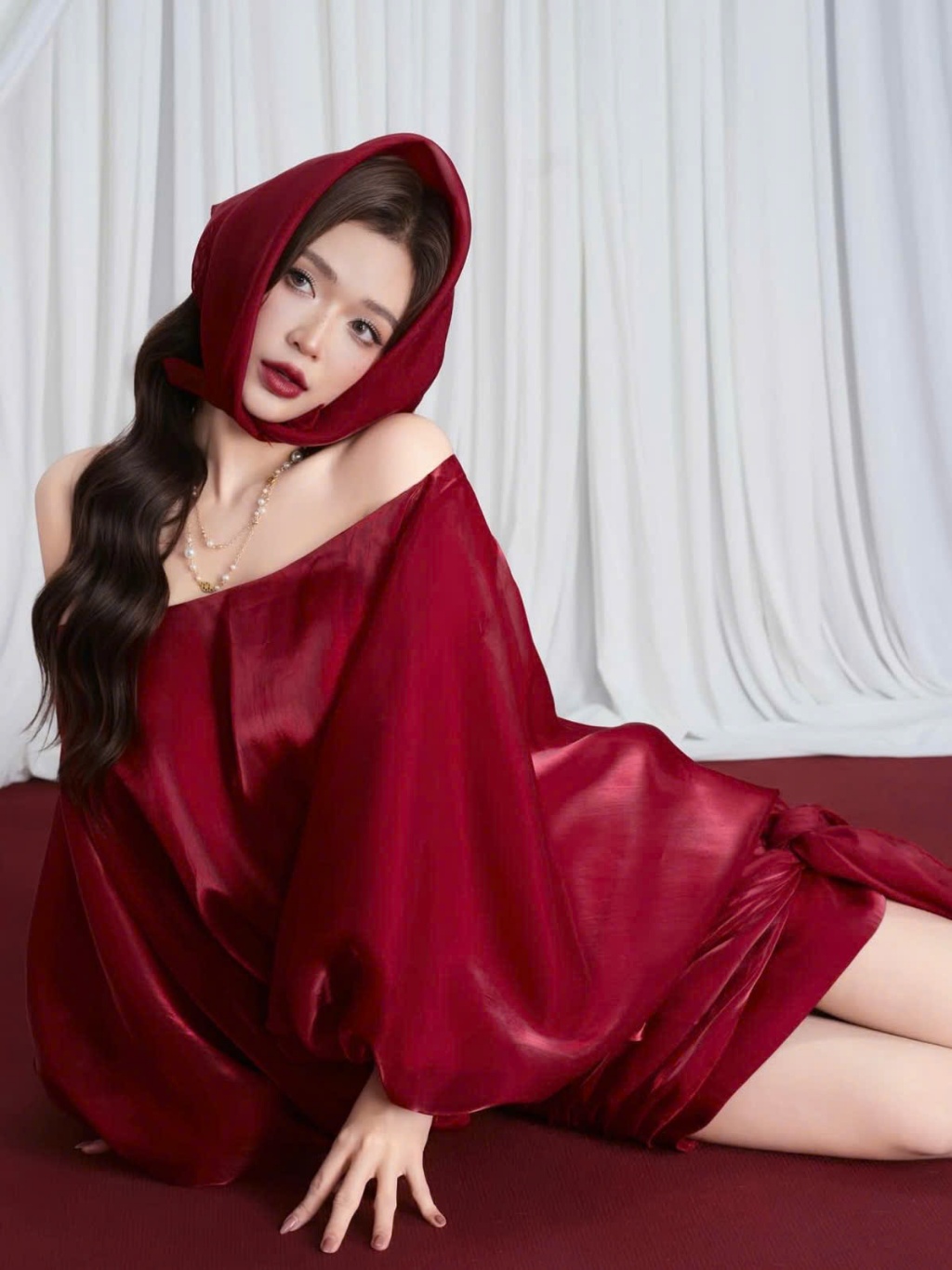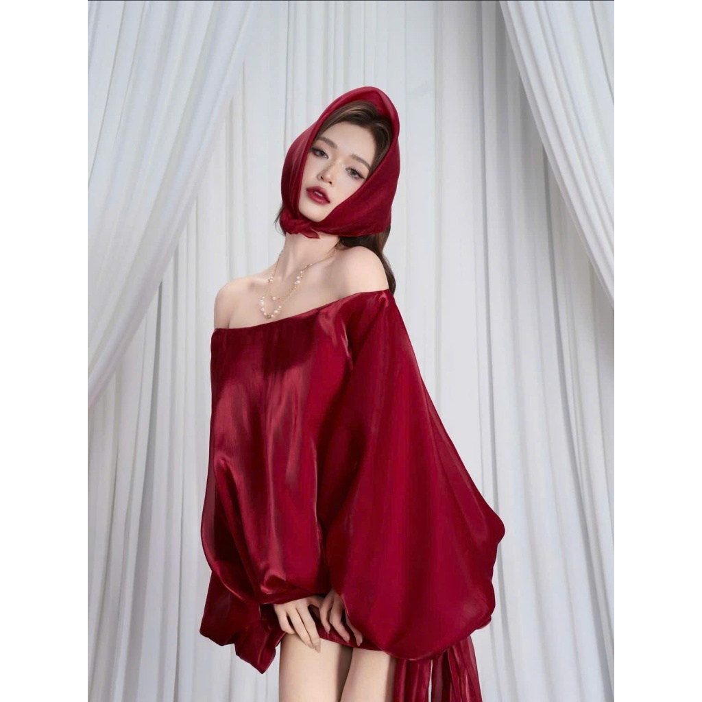 [Deal mở bán] Đầm Trễ Vai Màu Đỏ Tay Phồng Tiểu Thư Siêu Xinh