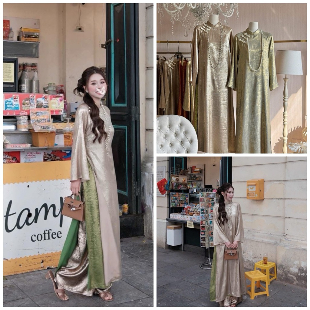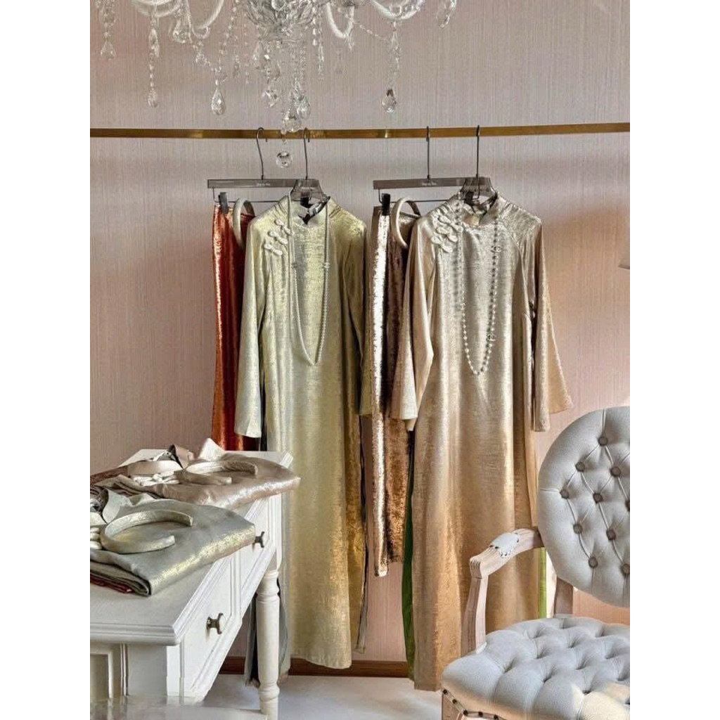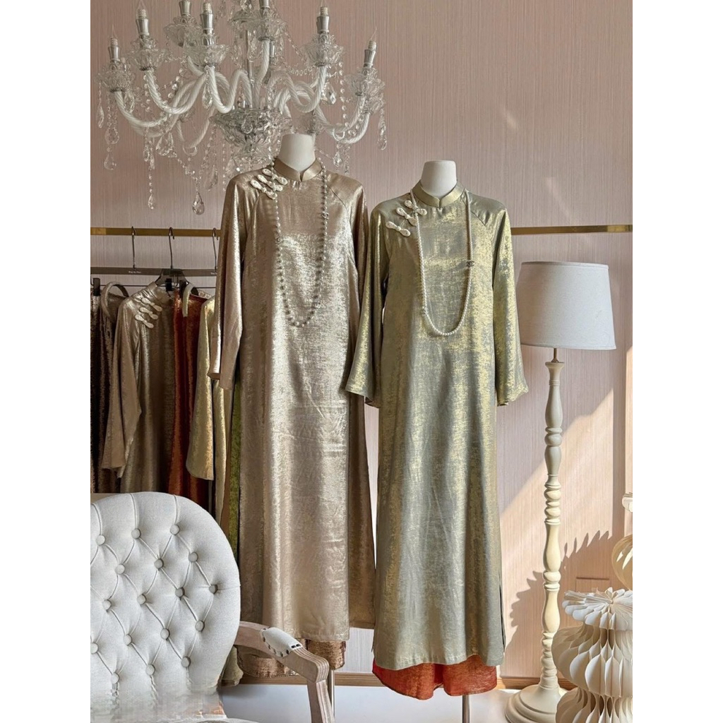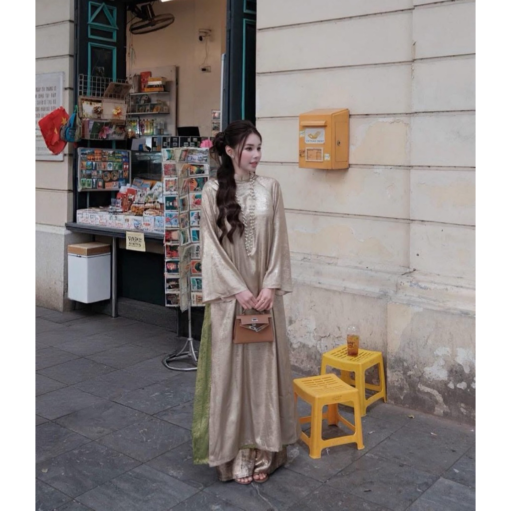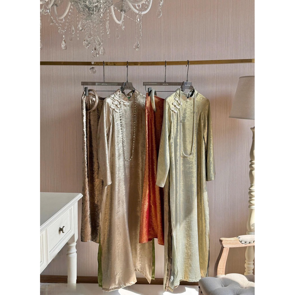 Áo Dài “Mẫn Kỳ” Áo Dài Nhũ Ánh Kim Dáng Suông Cách Tân 4 Tà Mix Quần Cùng Chất Áo, Áo dài tết 2026